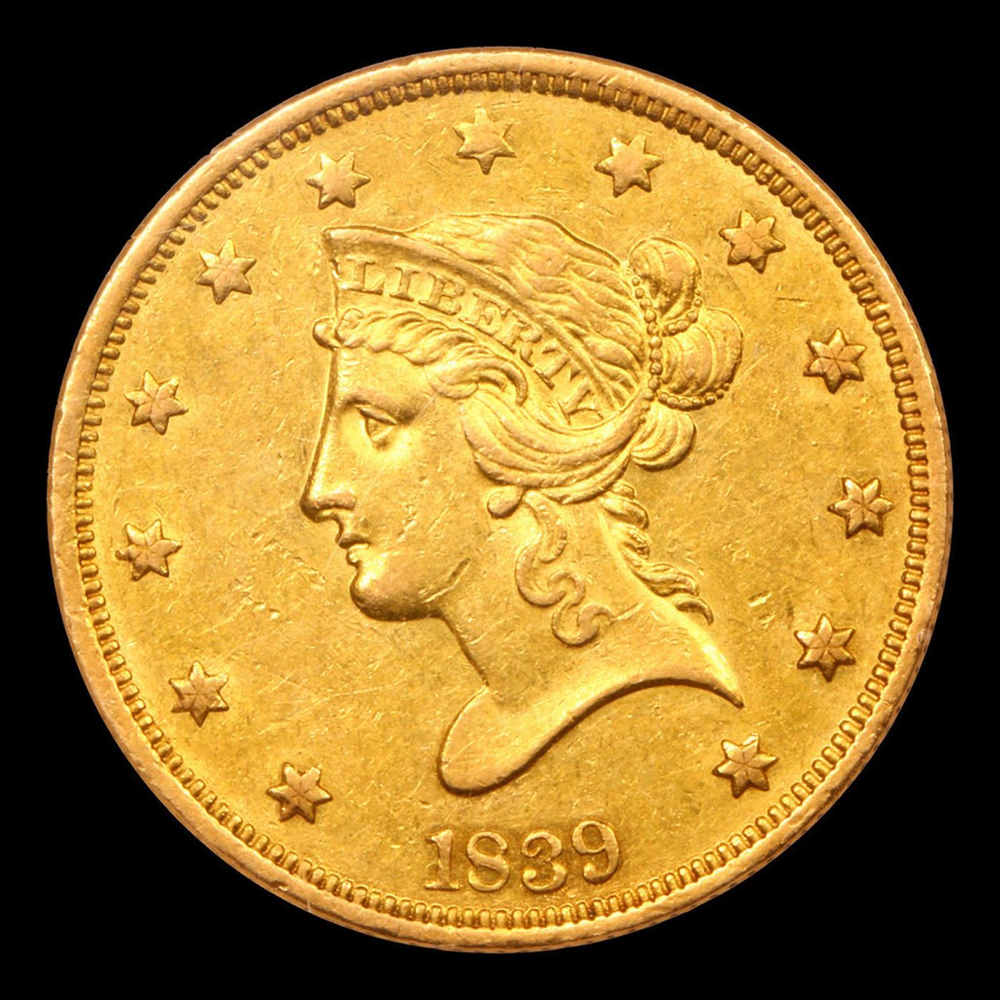 ***Auction Highlight*** NGC 1839/8 Type of 38 Gold Liberty Eagle $10 Graded au58 BY NGC. Offered is an exceedingly rare coin, one of the finest known Liberty Head eagles of the brief and challenging Type of 1838 design. The entire coin displays vivid reddish-gold patina, The design elements in the centers are fully rendered, and the surfaces are very nice for the assigned grade. A beautiful and very rare $10 gold coin that will appeal to both advanced gold type collectors and Liberty Head eagle enthusiasts.The longest-running $10 gold eagle series produced in the United States Mint, the Liberty Head eagle was struck without interruption from 1838 through early 1907. It is the first eagle produced since 1804, President Thomas Jefferson having halted production of both this denomination and the silver dollar that year as rising bullion prices made the coins highly susceptible to melting by speculators. From 1805 through 1837, the largest gold denomination that the United States Mint produced was the $5 half eagle. By 1838, however, two laws had been passed that made it possible for the Mint to resume eagle coinage. The first was the Act of June 28, 1834, which reduced the weight of standard U.S. gold coins and, in so doing, placed the nation's monetary system on a gold standard. The second was the Act of January 18, 1837, a general overhaul of the nation's coinage laws that, among other things, standardized the fineness of gold and silver coins at 900 thousandths.When eagle production finally resumed in 1838, the Mint settled upon the Liberty Head design of Christian Gobrecht, featuring a portrait of Liberty facing left, her hair tied in a bun at the back of her head and wearing a coronet inscribed LIBERTY. 13 stars encircle the border, and the date is below the portrait. The initial portrait utilized in 1838 and early 1839 had deeper curvature to the truncation of the bust with Liberty's hair pulled back over her ear. The design was modified slightly in 1839 to create the Liberty Head motif that would remain in use through 1907.The basic reverse design also remained unchanged from 1838 to 1907, featuring an eagle with outstretched wings and a shield on its breast. The eagle clutches a group of three arrows in its left talon and an olive branch in its right talon. The legend UNITED STATES OF AMERICA is around the border and the denomination TEN D. is below the eagle. The reverse was modified in 1866, however, with the addition of the motto IN GOD WE TRUST on a scroll above the eagle. To distinguish them from their No Motto predecessors, the Motto eagles of 1866 to 1907 are known as the Type II Liberty Head design.As above, the first iteration of Christian Gobrecht's new Liberty Head eagle bore a distinctive obverse featuring a sweep of hair completely covering Liberty's ear and a peculiarly deep curve to the bust's truncation. Benjamin West's painting Omnia Vincit Amor ("Love Conquers All") served as Gobrecht's model, even down to the beaded cord and coronet style. The first eagles using this design were struck at the end of 1838, with 7,200 pieces intended for circulation on top of four "specimen" coins presented to Secretary of the Treasury Levi Woodbury. In 1839, the same obverse design was employed for the first 2,801 eagles struck bearing that date before the design was modified.The 1839 Type of 1838 eagle is a very scarce coin in all grades, with perhaps just under 250 examples known, with the vast majority well circulated. In Mint State this issue is a formidable rarity and, as with so many dates in the Liberty Head eagle series, it is also an underrated one A Key Date's Pick, Bid to Win, Don't let it get Away, you might not find its equal Coin. I give this coin my highest recommendation