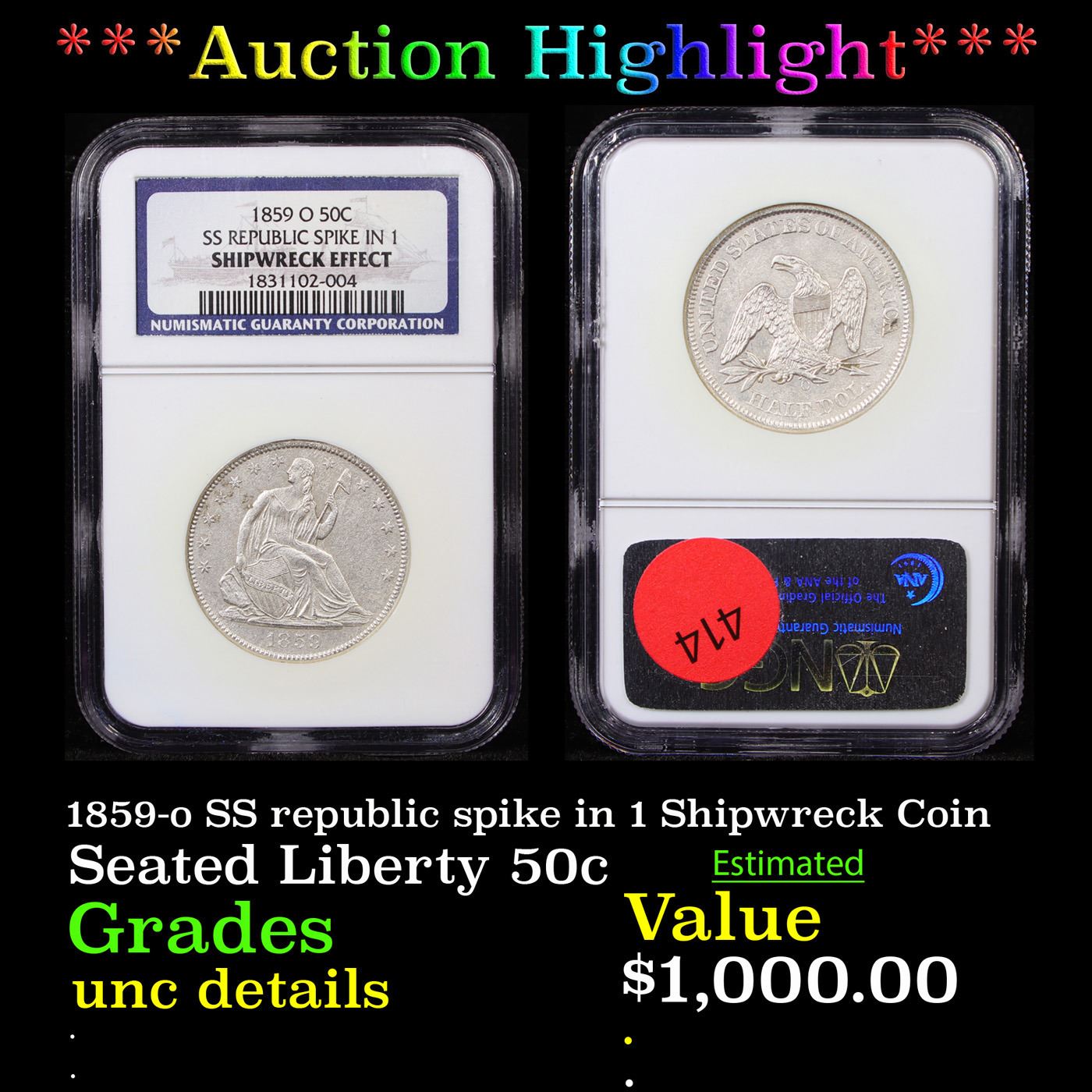 ***Auction Highlight*** NGC 1859-o SS republic spike in 1 Shipwreck Coin Seated Half Dollar 50c Graded unc details By NGC.Up for Auction is a coin salvaged from the Legendary “Ship of Gold” the USS Central America. Now while Gold for the most part is unaffected by seawater, the same cannot be said for silver, hence the grade on this recovered 1859-o Half as just “shipwreck effect”. Still a piece of history and owning a coin salvaged from the sea floor aboard that legendary vessel is something to talk about. A Corey's Pick, Bid to Win, Don't let it get Away Coin
