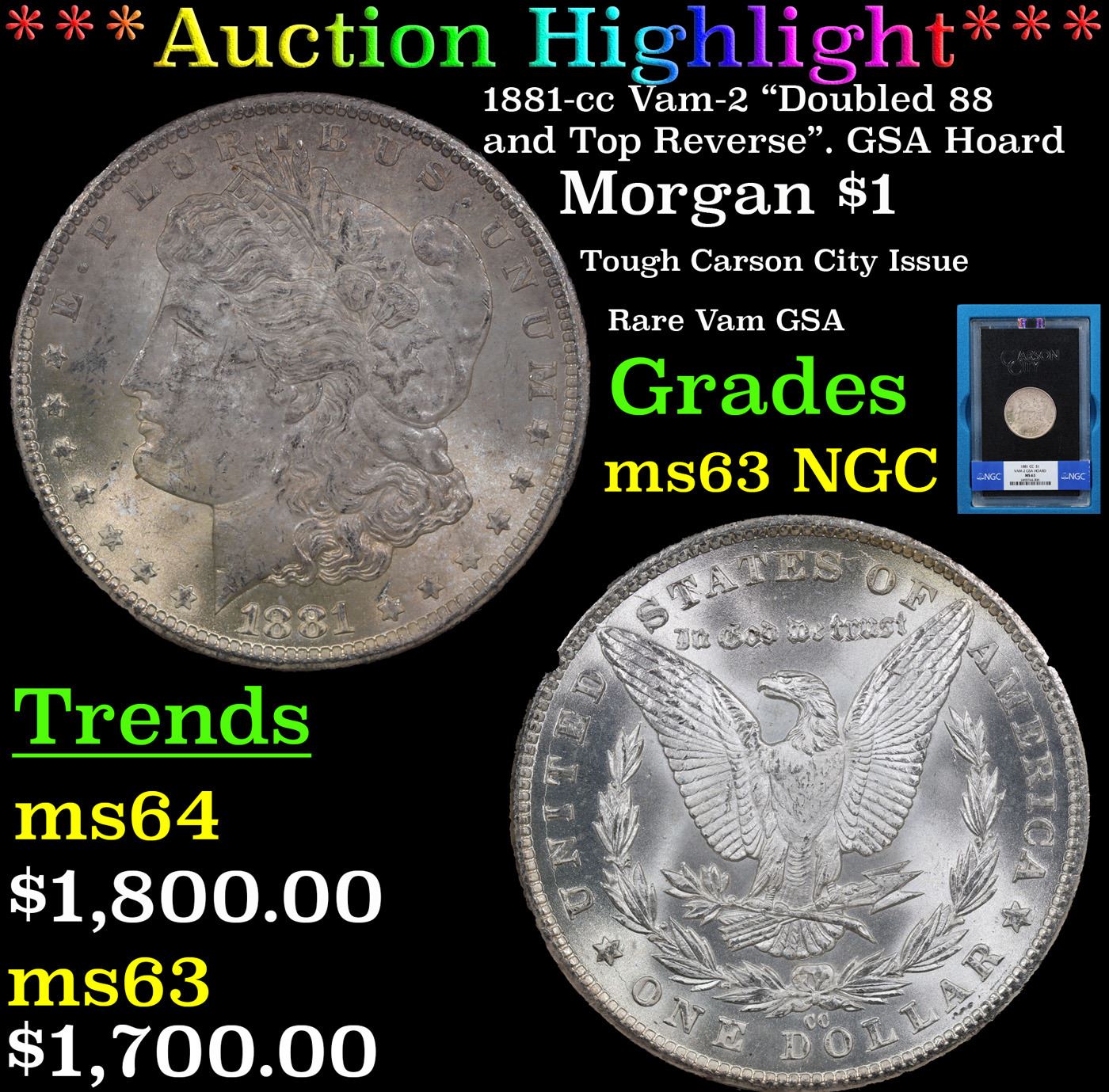 ***Auction Highlight*** NGC 1881-cc Vam-2 "Doubled 88 and Top Reverse". GSA Hoard Morgan Dollar $1 Graded ms63 By NGC. Come In Origninal Box