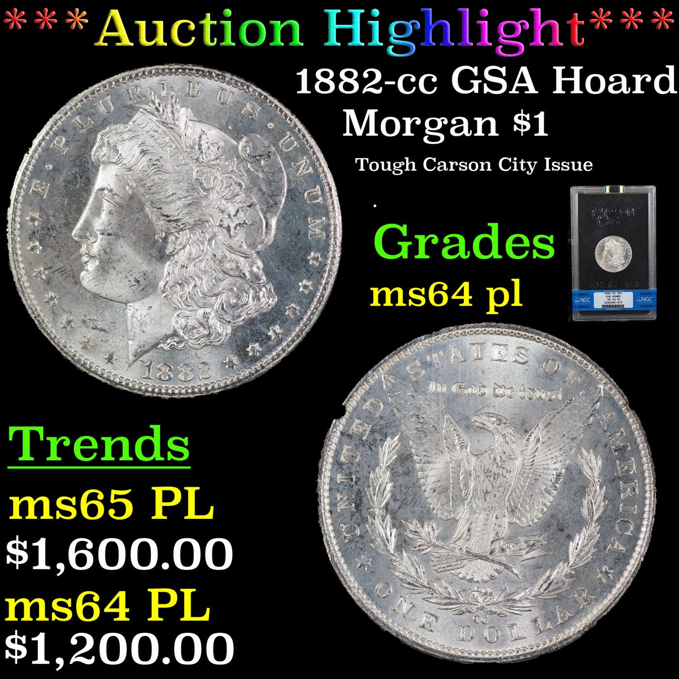 ***Auction Highlight*** NGC 1882-cc GSA Hoard Morgan Dollar $1 Graded ms64 pl By NGC. Come in orignial box and casing