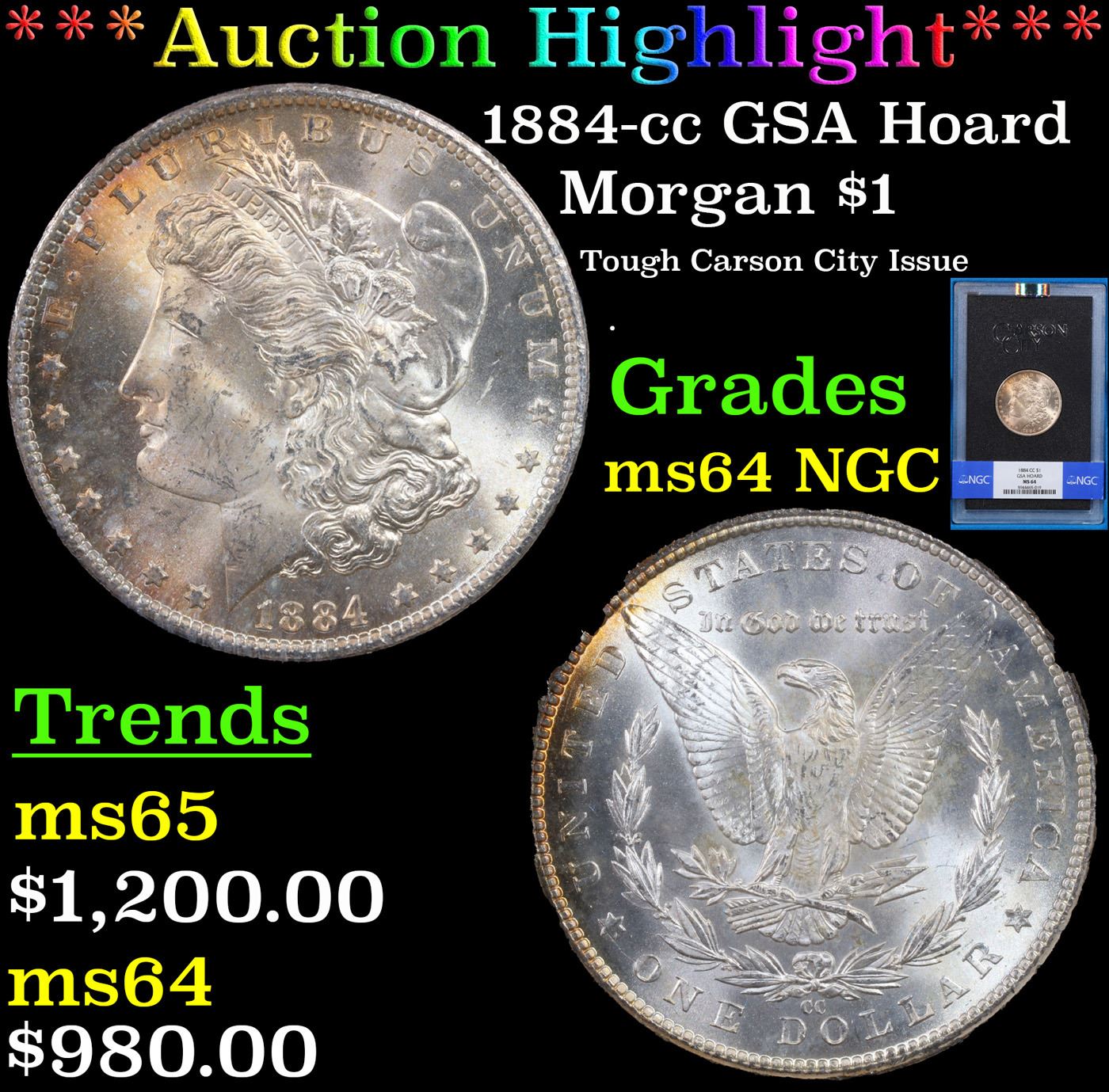 ***Auction Highlight*** NGC 1884-cc GSA Hoard Morgan Dollar $1 Graded ms64 By NGC. Came in Case and COA