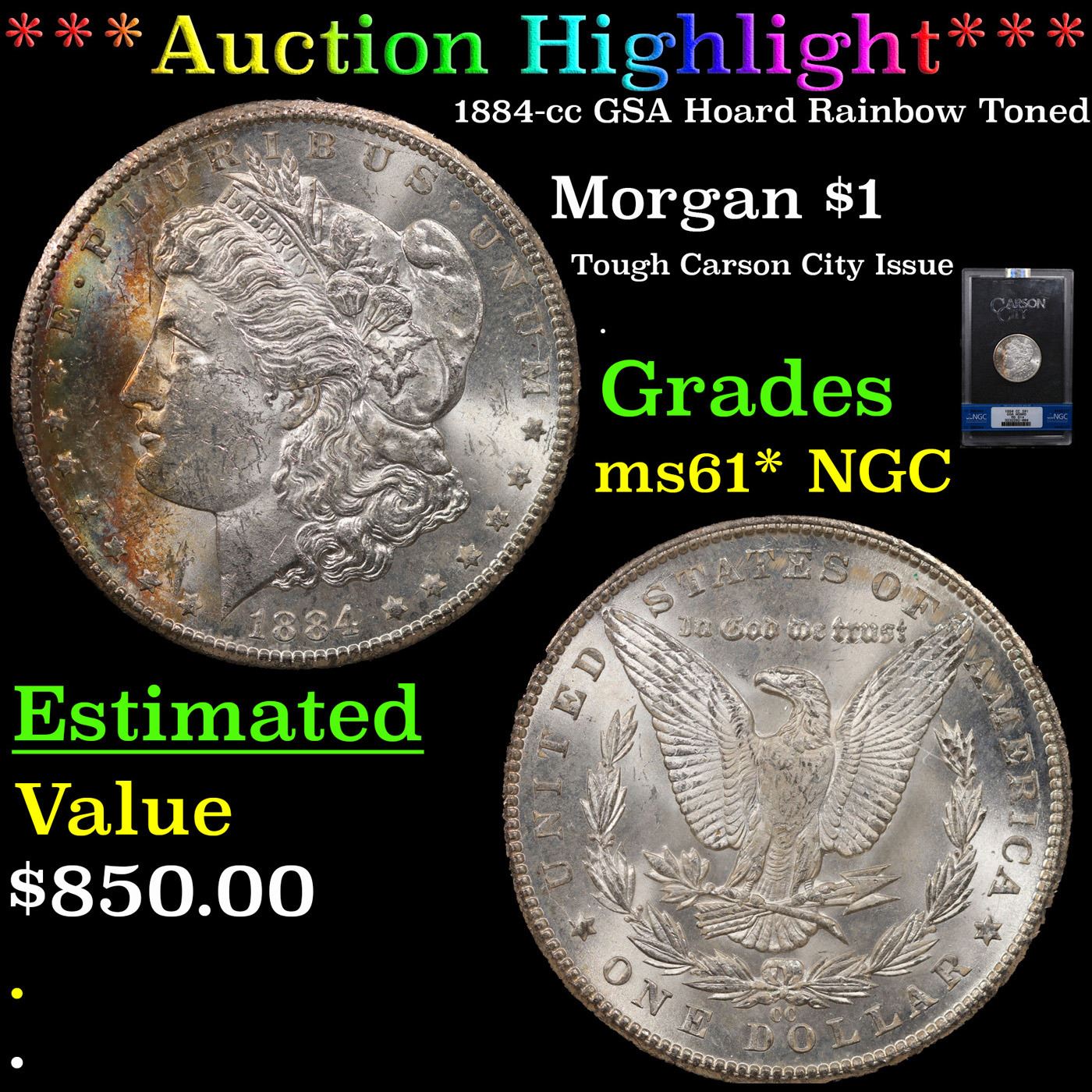 ***Auction Highlight*** NGC 1884-cc Morgan Dollar GSA Hoard Rainbow Toned $1 Graded ms61* BY NGC (fc