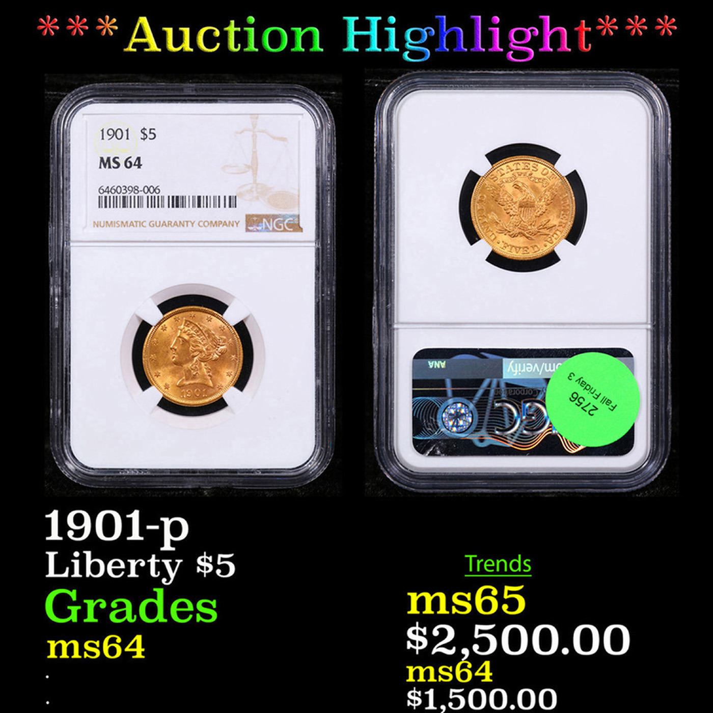 ***Auction Highlight*** NGC 1901-p Gold Liberty Half Eagle $5 Graded ms64 By NGC.