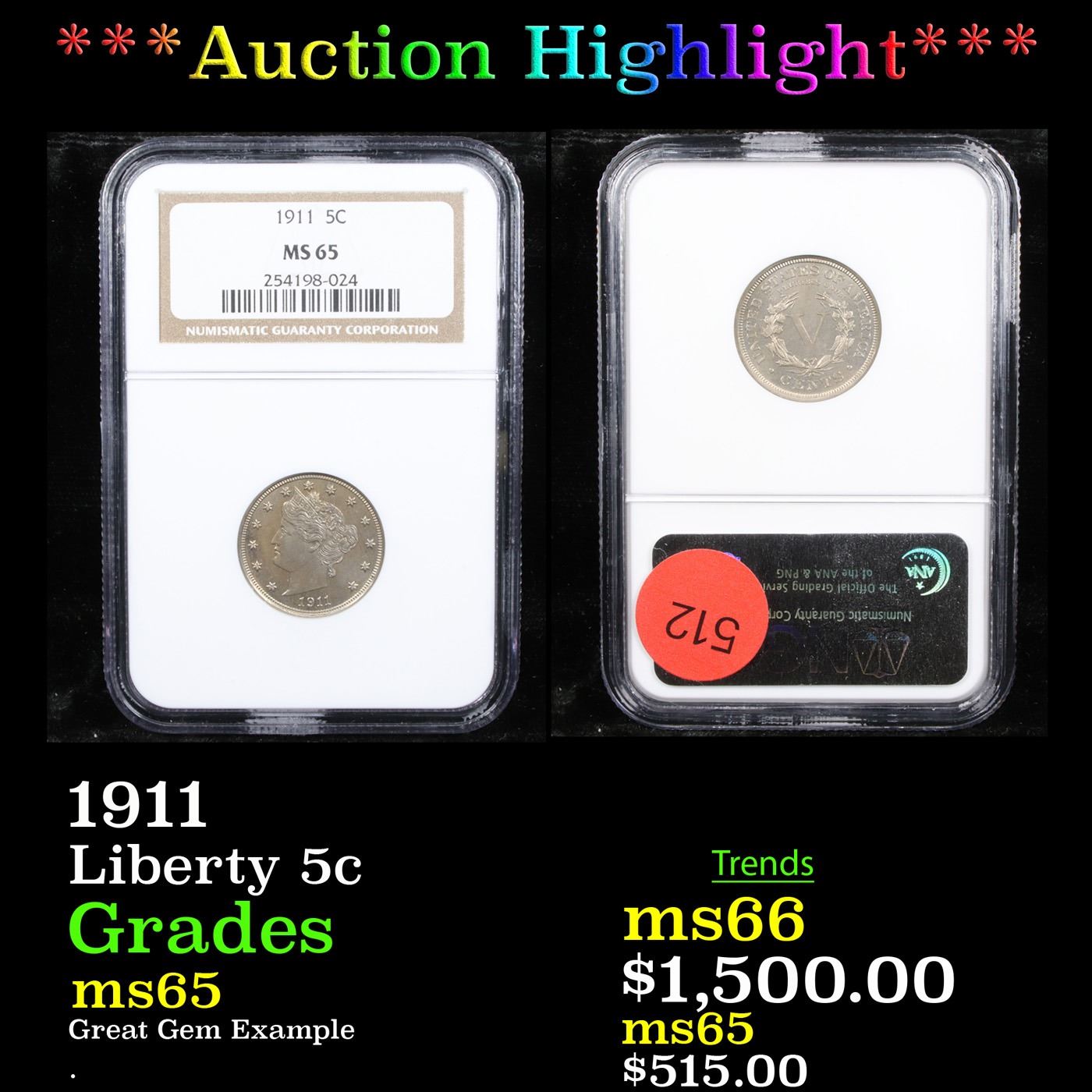 ***Auction Highlight*** NGC 1911 Liberty Nickel 5c Graded ms65 By NGC.