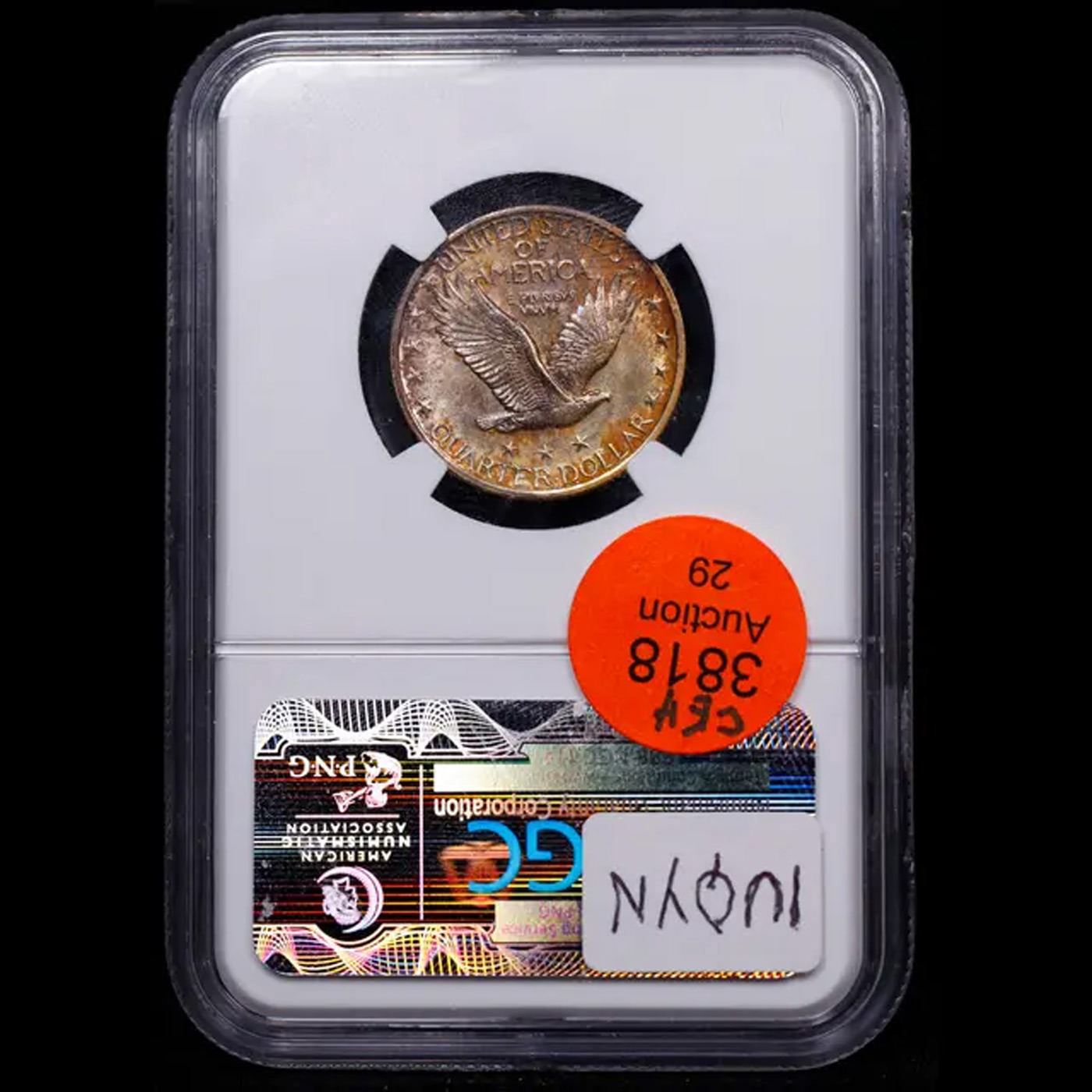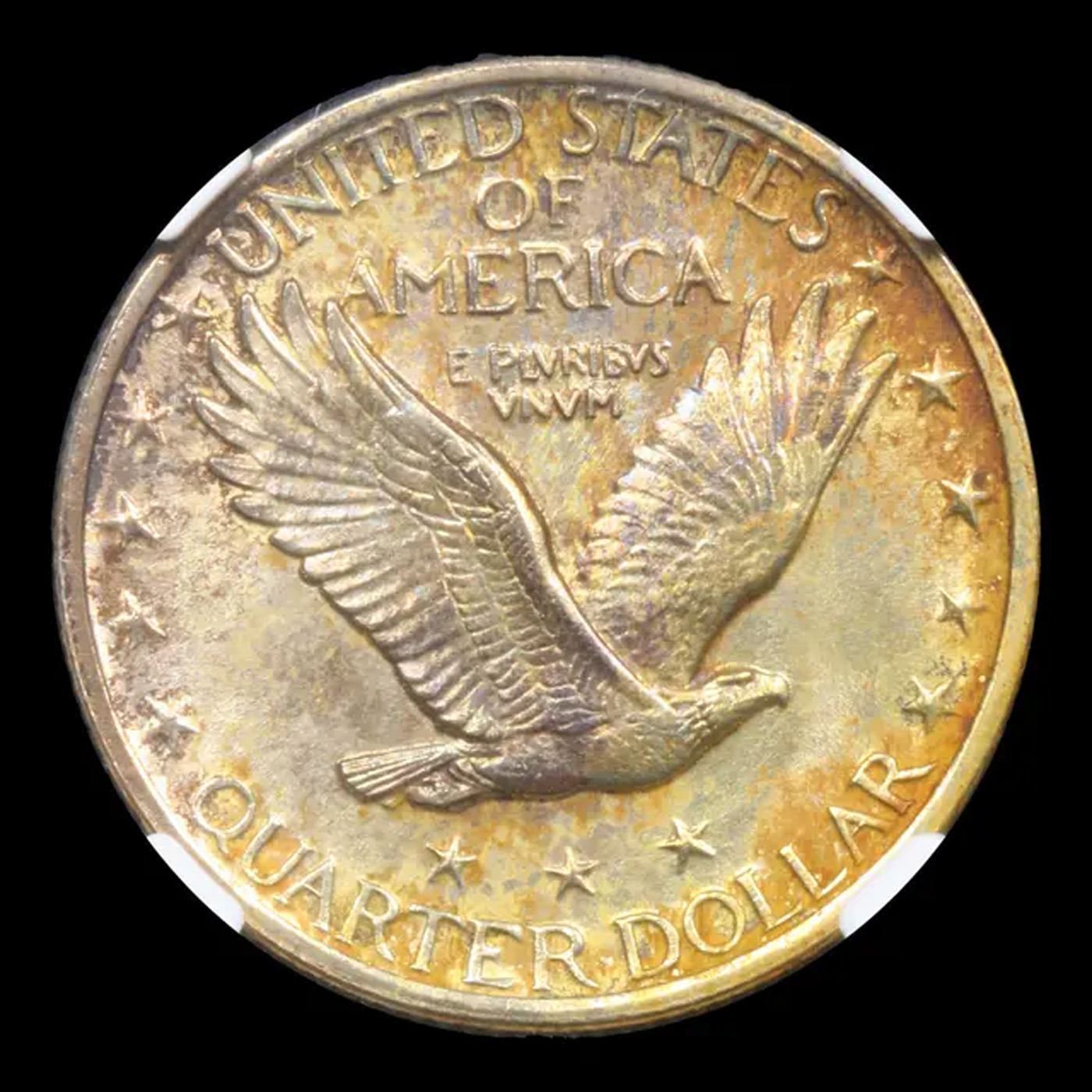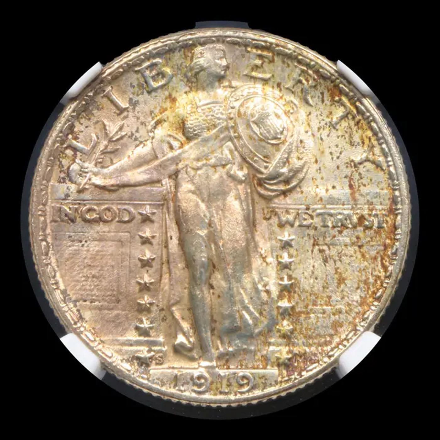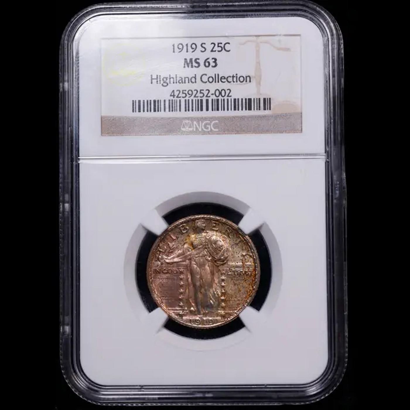 ***Auction Highlight*** NGC 1919-s Highland Collection Standing Liberty Quarter 25c Grades ms63 By NGC. A pink champagne obverse pairs with a sunshine yellow reverse on this visually interesting specimen with a boldly struck shield and strong details in Liberty's head. A Key Date's Pick, Bid to Win, Don't let it get Away, you might not find its equal Coin. I give this coin my highest recommendation