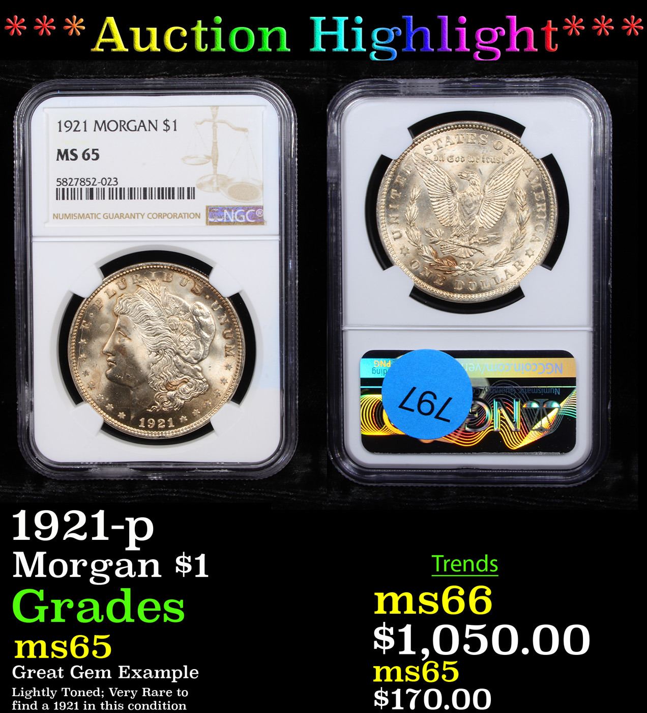 ***Auction Highlight*** NGC 1921-p Morgan Dollar $1 Graded ms65 By NGC.