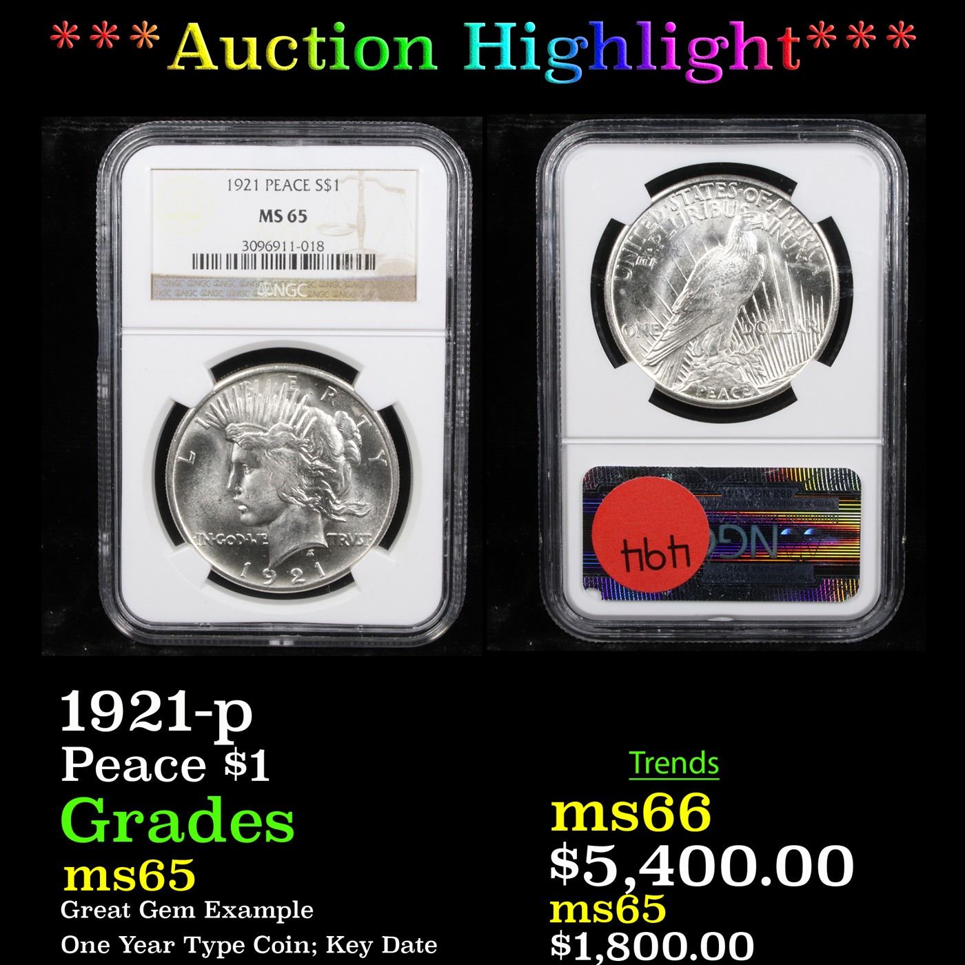 ***Auction Highlight*** NGC 1921-p Peace Dollar $1 Graded ms65 By NGC. A Corey's Pick, Bid to Win, Don't let it get Away Coin