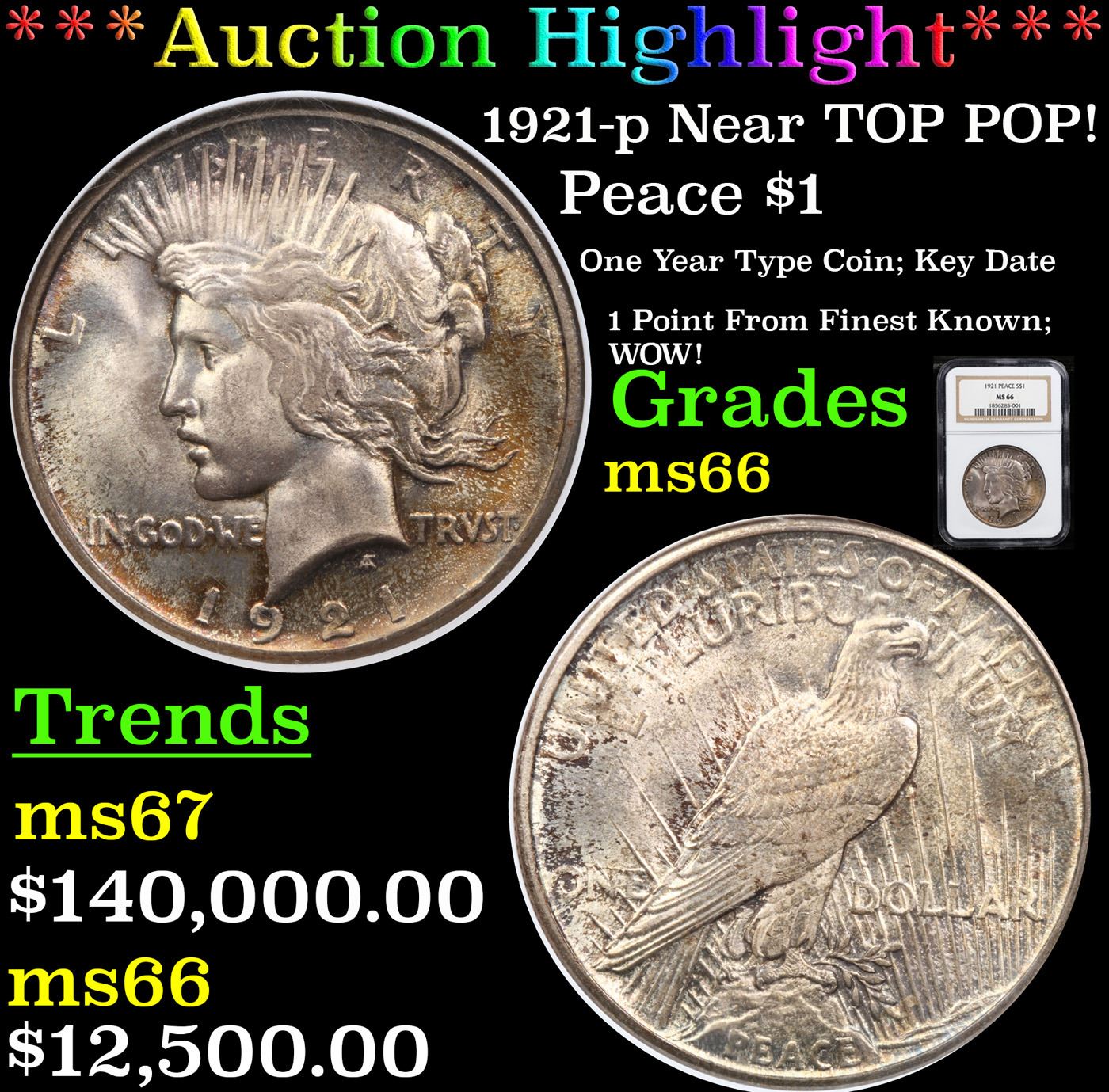 ***Auction Highlight*** NGC 1921-p Near TOP POP! Peace Dollar $1 Graded ms66 By NGC. A Corey's Pick, Bid to Win, Don't let it get Away, you might not find its equal Coin. I give this coin my highest recommendation