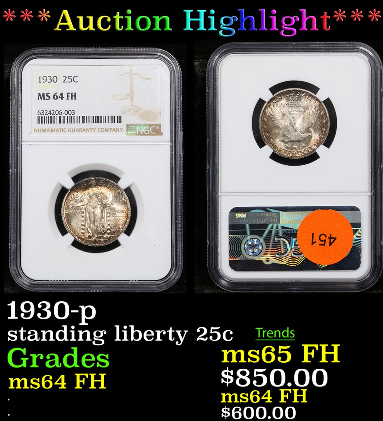 ***Auction Highlight*** NGC 1930-p Standing Liberty Quarter 25c Graded ms64 FH By NGC.