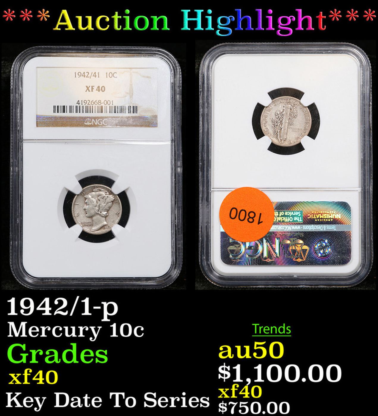 ***Auction Highlight*** NGC 1942/1-p Mercury Dime 10c Graded xf40 By NGC.