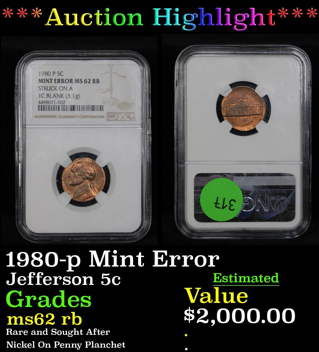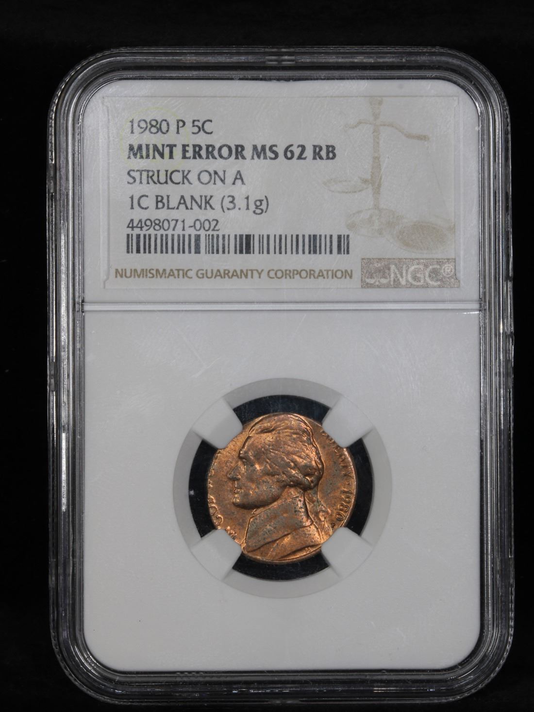 ***Auction Highlight*** NGC 1980-p Mint Error Nickel On Penny Planchet Rare and Sought After Jefferson Nickel 5c Graded ms62 rb By NGC. A Corey's Pick, Bid to Win, Don't let it get Away, you might not find its equal Coin