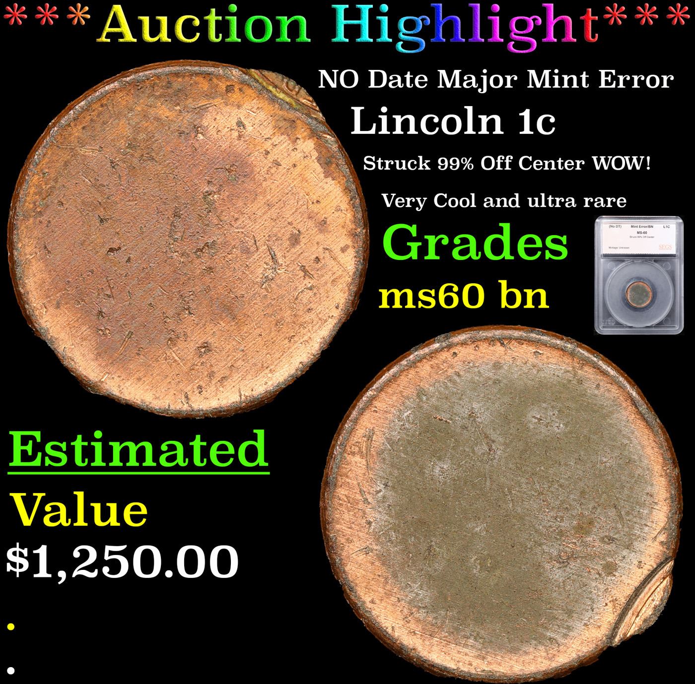 ***Auction Highlight*** NO Date Major Mint Error Lincoln Cent 1c Graded ms60 bn By SEGS. A Corey's Pick, Bid to Win, Don't let it get Away, you might not find its equal Coin. I give this coin my highest recommendation