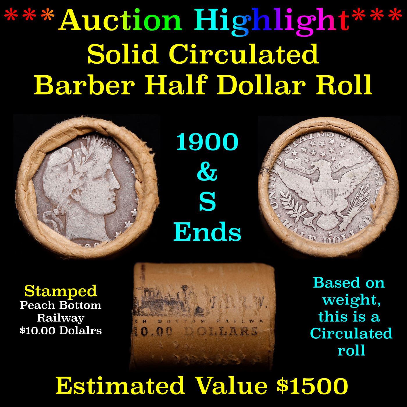 ***Auction Highlight*** Old 50c Roll $10 Halves Solid Barber Half dollar Roll with 1900 & S Ends. Up for auction is a Full Solid roll of 20 Barber Half dollars in an old Peach Bottom Railway Company Wrapper with Tight Shotgun Ends.