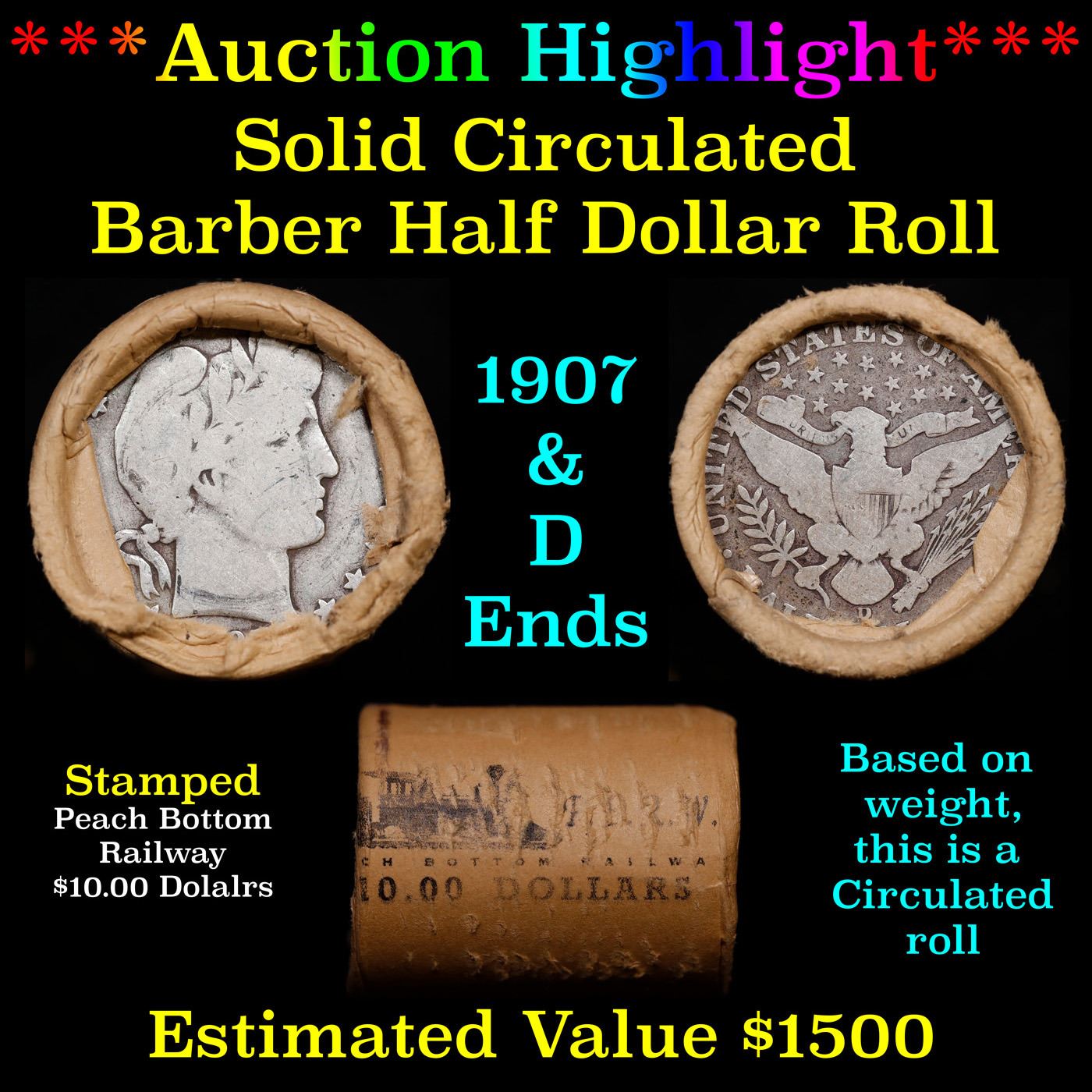 ***Auction Highlight*** Old 50c Roll $10 Halves Solid Barber Half dollar Roll with 1907 & D Ends. Up for auction is a Full Solid roll of 20 Barber Half dollars in an old Peach Bottom Railway Company Wrapper with Tight Shotgun Ends.