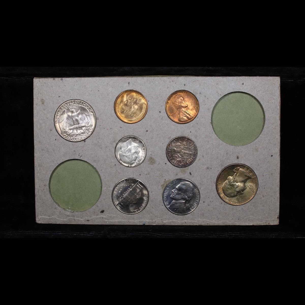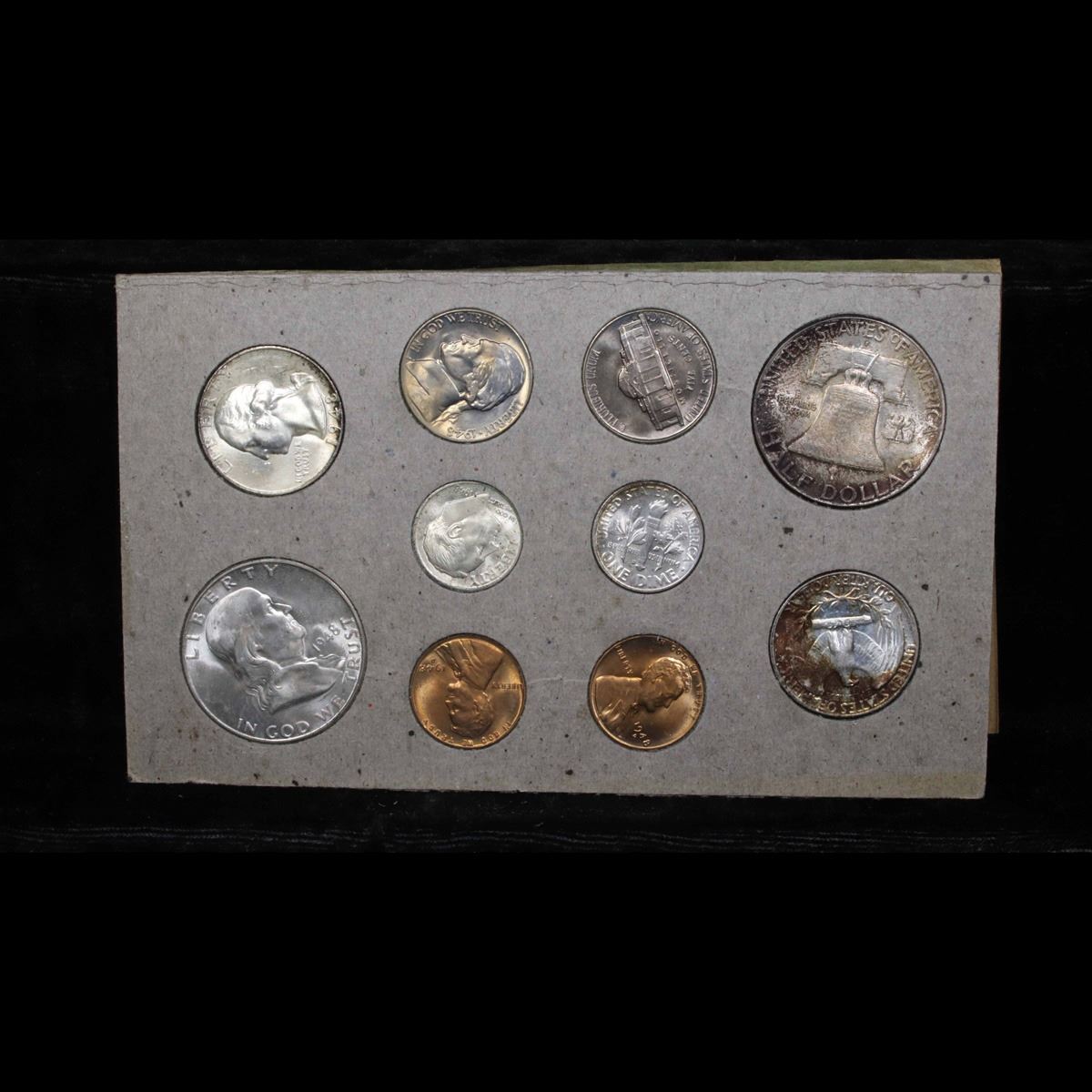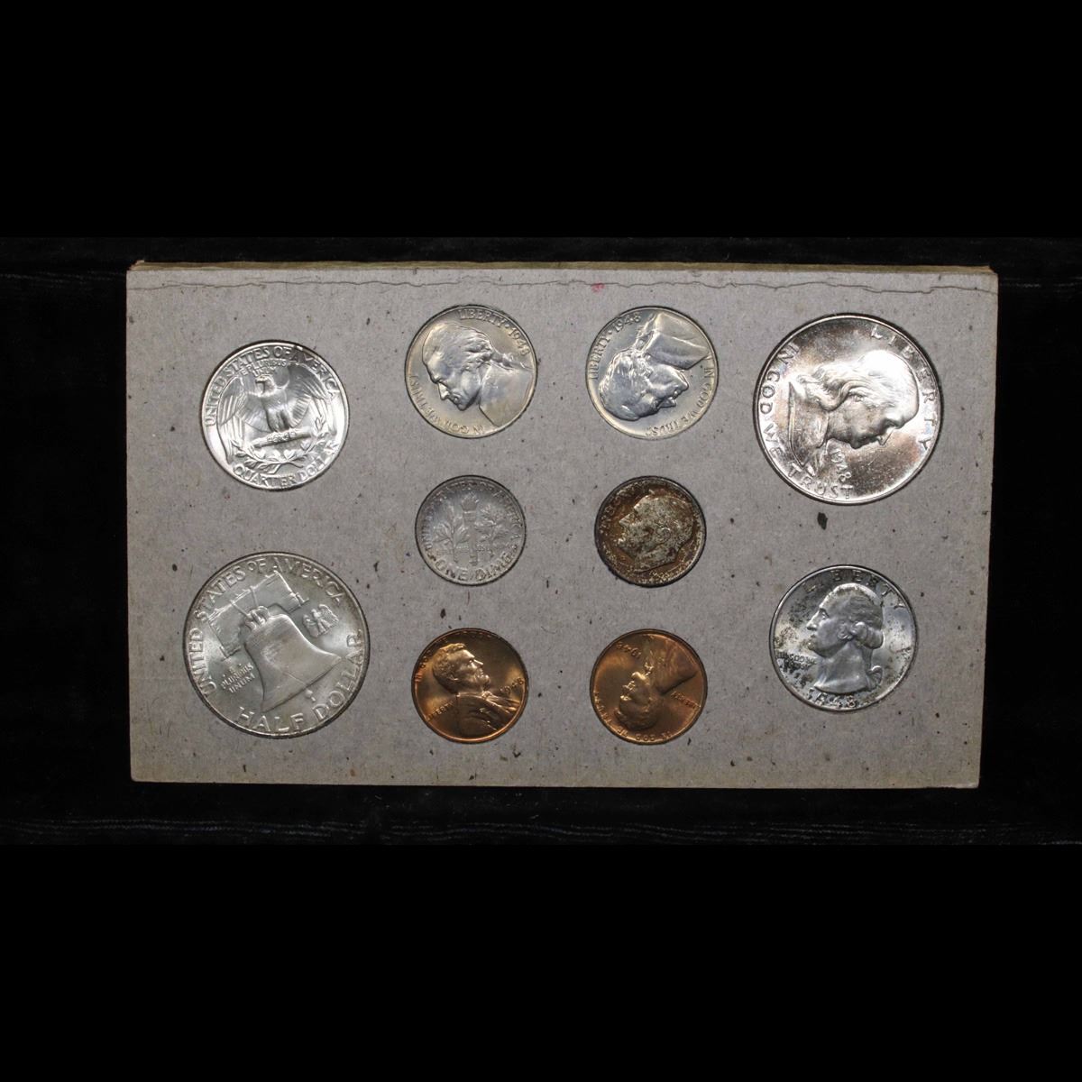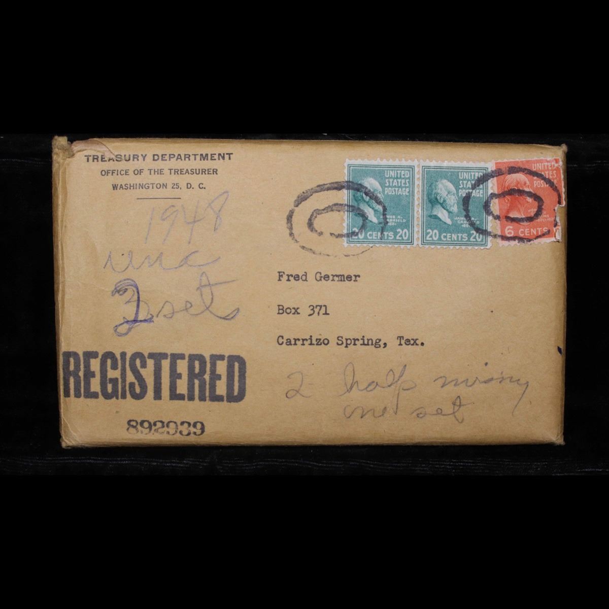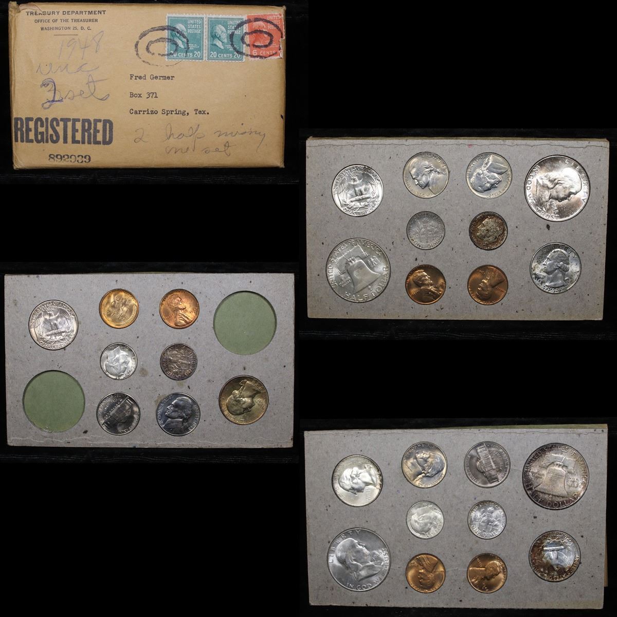 ***Auction Highlight*** Original 1948 Double Mint Set and includes 28 coins, . 1948 Double silver mint set and includes 2 of each coin minted for 1948. This lot includes 28 coins, the full p, d and s runs. The 'p' run has: 2 Walking Liberty Half dollars, 2 Washington quarters, 2 Roosevelt Dimes, 2 Jefferson nickels and 2 lincoln cents; the 'd' run has 2 Walking Liberty Half Dollar, 2 Washington quarters, 2 Roosevelt dimes, 2 Jefferson nickels and 2 Lincoln cents; the 's' mint has 2 Washington Quarters, 2 Roosevelt dimes, 2 Jefferson Nickels, and 2 lincoln cents. The coins are in the original cardboard holders with attached paper flaps as issued by the mint. Each holder contains two examples of each coin from the mint where is was made. The holders were placed in storage and shipping envelopes. As in previous years, the sulfur content of the packaging often resulted in distinctive toning on the coins. This is a great original 1948 mint set. Very nice and tough set.