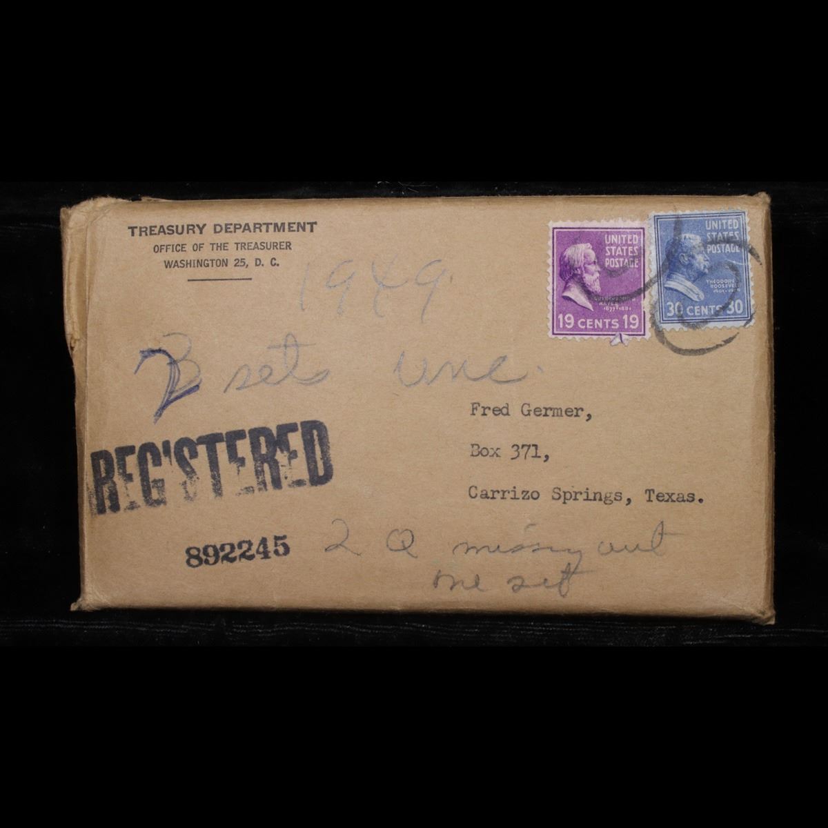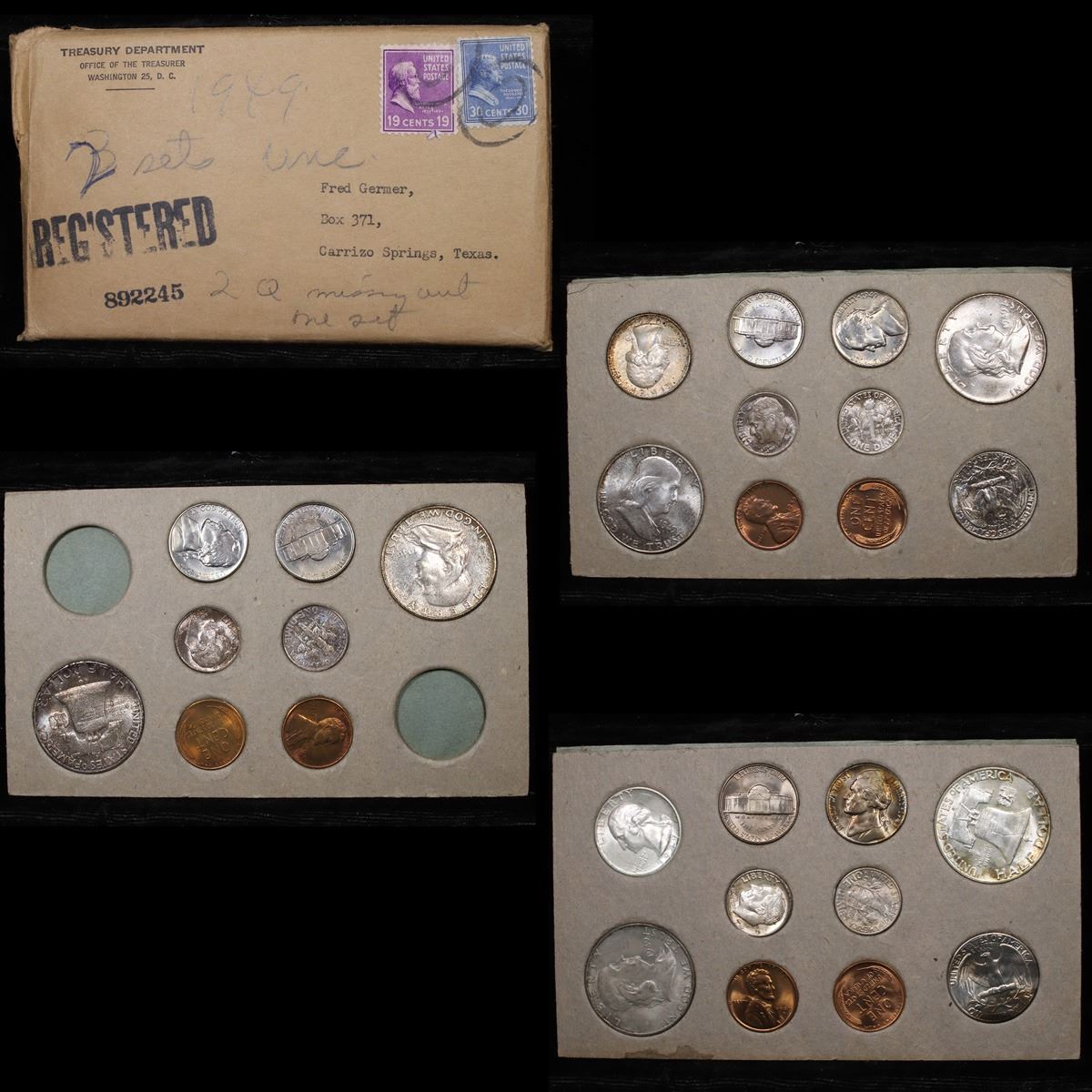 ***Auction Highlight*** Original 1949 Double Mint Set and includes 28 coins,. 1949 Double silver mint set and includes 2 of each coin minted for 1949. This lot includes 28 coins, the full p, d and s runs. The 'p' run has: 2 Franklin Half dollars, 2 Washington quarters, 2 Roosevelt Dimes, 2 Jefferson nickels and 2 lincoln cents; the 'd' run has 2 Franklin Half Dollar, 2 Washington quarters, 2 Roosevelt dimes, 2 Jefferson nickels and 2 Lincoln cents; the 's' mint has 2 Franklin Half Dollars, 2 Roosevelt dimes, 2 Jefferson Nickels, and 2 lincoln cents. There were no Quarters minted in San Francisco in 1949. The coins are in the original cardboard holders with attached paper flaps as issued by the mint. Each holder contains two examples of each coin from the mint where is was made. The holders were placed in storage and shipping envelopes. As in previous years, the sulfur content of the packaging often resulted in distinctive toning on the coins. This is a great original 1949 mint set. Very nice and tough set. It also has the original mailing envelope.