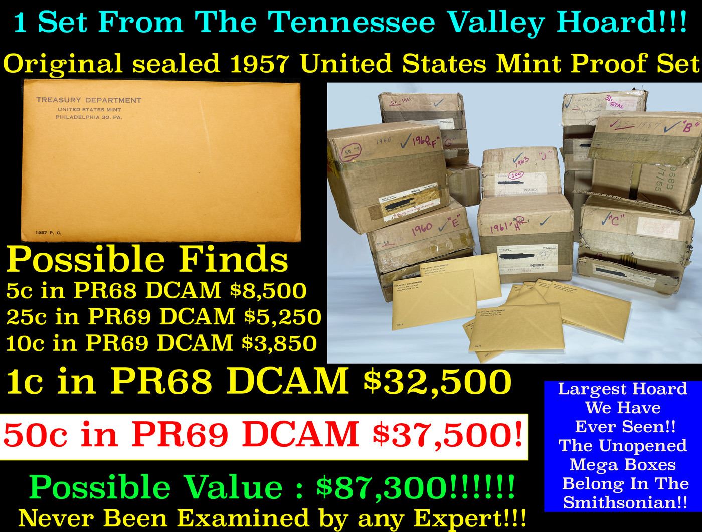 ***Auction Highlight*** Original sealed 1959 United States Mint Proof Set Tennessee Valley Hoard. Original sealed 1959 United States Mint Proof Set Tennessee Valley Hoard. Once in a lifetime collection We are proud to bring to auction the greatest proof collection of the late 1950s and early 1960s. Finding cameo and deep cameo proofs from this era is near impossible u less you pay full retail and buy them already holdered. All of the sets at coin shows have been examined and have virtually no cameos. The only way to get the same odds of finding one of these valuable cameos is to buy an unopened set.