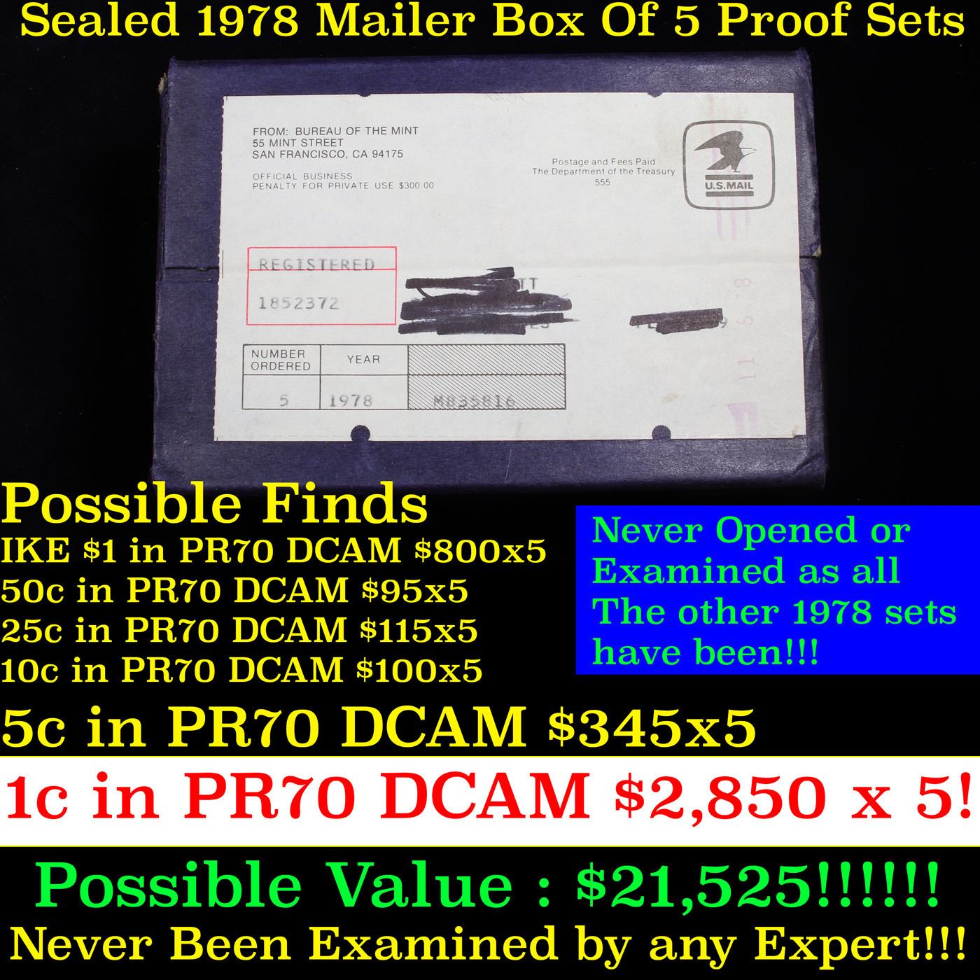 ***Auction Highlight*** Original sealed box 4- 1978 United States Mint Proof Sets. Up for Auction is an Unopened Mailer Box from 1978containing 5 1978 Proof Sets!!!! Wow! - This Mailer Box is sealed exactly as it left the mint over 40 years ago. Each Proof set in this mailer box has never been reviewed or examined by anyone. Virtually every 1978Proof Set has been looked at by Coin Experts who have identified potential PR70 DCAM Coins and had them slabbed. Those opened Proof Sets you find at coin shows or for sale individually have almost certainly been examined and reviewed. NOT ONE OF THE FIVE SETS IN THIS MAILER BOX HAVE BEEN SEEN BY HUMAN EYES IN 40 YEARS , So, What COULD be in these Sets, Well here are the 5 things that could be inside. A Ike $1 in PR70 DCAM Trending $800!!! A Kennedy 50c in PR70 DCAM Trending $95, a Washington 25c in PR70 DCAM Trending $115, a Roosevelt Dime in PR70 DCAM Trending $100, BUT That’s Just the Start, There also could be a Jefferson 5c in PR70 DCAM, TRENDING $345, BUT EVEN THAT IS JUST THE SIDESHOW! The REAL WINNER IN THIS LOTTERY BOX IS The Lincoln Penny, a 1978 PROOF Lincoln 1c in PR70 DCAM TRENDS $2,850!!!! And there can be FIVE of Each in this BOX, This could be one of the very last boxes in EXISTENCE. This “WONKA” Box could Contain Coins Worth $21,525 - Good Luck in Obtaining This Unopened Mailer Box of 5 1978 Proof Sets!!!