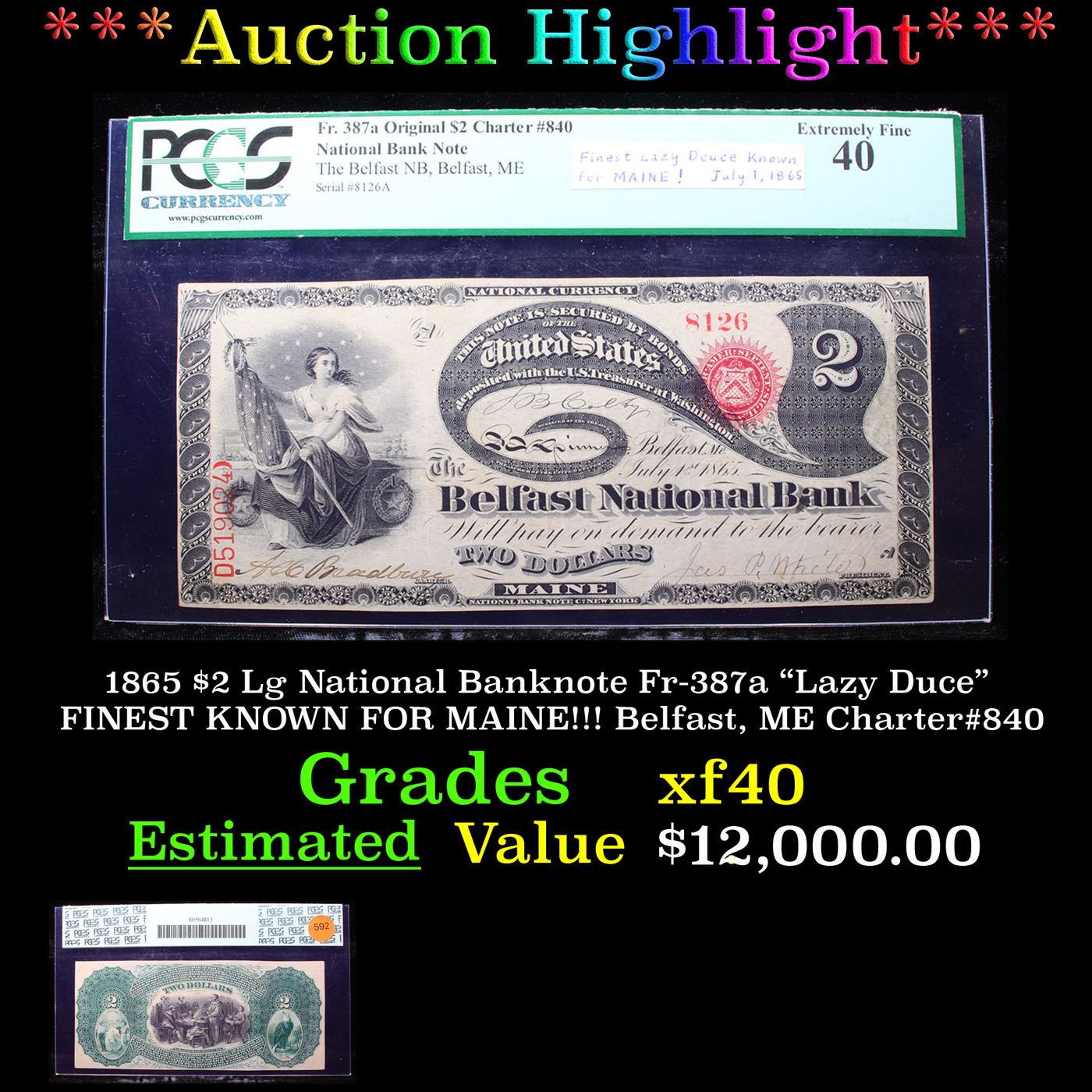 ***Auction Highlight*** PCGS 1865 $2 Lg National Banknote Fr-387a "Lazy Duce" FINEST KNOWN FOR MAINE!!! Belfast, ME Charter#840 Graded xf40 By PCGS. Up for auction is a fantastic and fascinating rarity, the earliest & Finest Known Lazy Deuce, National Bank Note for Maine! All lazy deuces are rare, but this wonderful certified survivor is drawn on a small coastal Maine town. A very pretty Original Series Lazy Deuce FINEST KNOWN from this Belfast National bank. It is well margined, retains virtually all of its original ink colors, and displays bold pen signatures. It has the appearance of a note that never really circulated but which just acquired a few light storage folds. A lovely note that will be a source of pride to its new owner. This Note is the FINEST Known Lazy Duce For all of maine. WE have never sold a lazy Duce before. 1 vf25 came to auction in may of 2018 at heritage and sold for $4,080 Otherwise this is the only other Belfast, Maine National Bank Note to come to auction in the last 10 years!