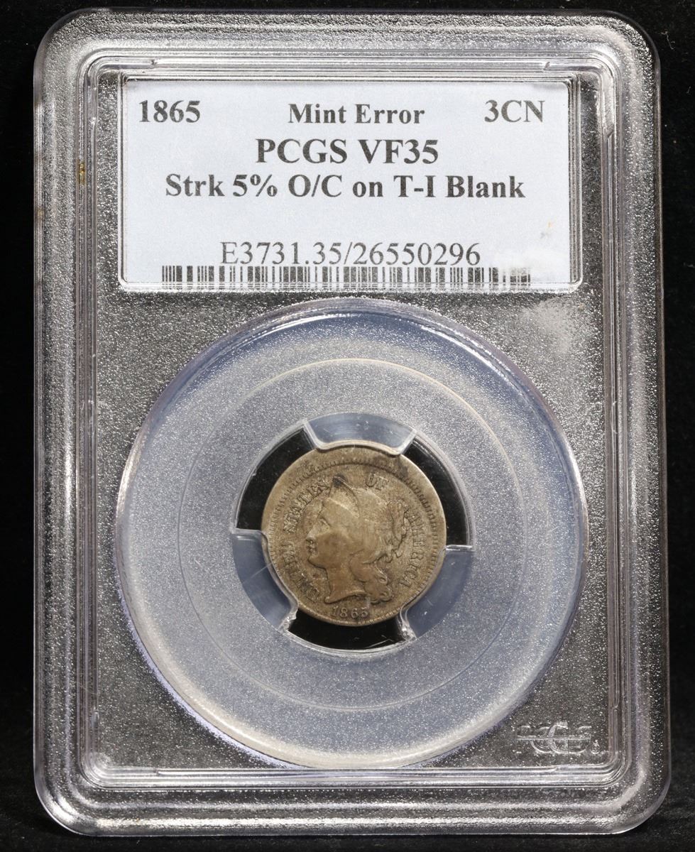 ***Auction Highlight*** PCGS 1865 Mint Error Struck 5% Off Center One of only 2 off center 3cn To be designated as a T1 Blank On PCGS Three Cent Copper Nickel 3cn Graded vf35 By PCGS. A Corey's Pick, Bid to Win, Don't let it get Away, you might not find its equal Coin. I give this coin my highest recommendation
