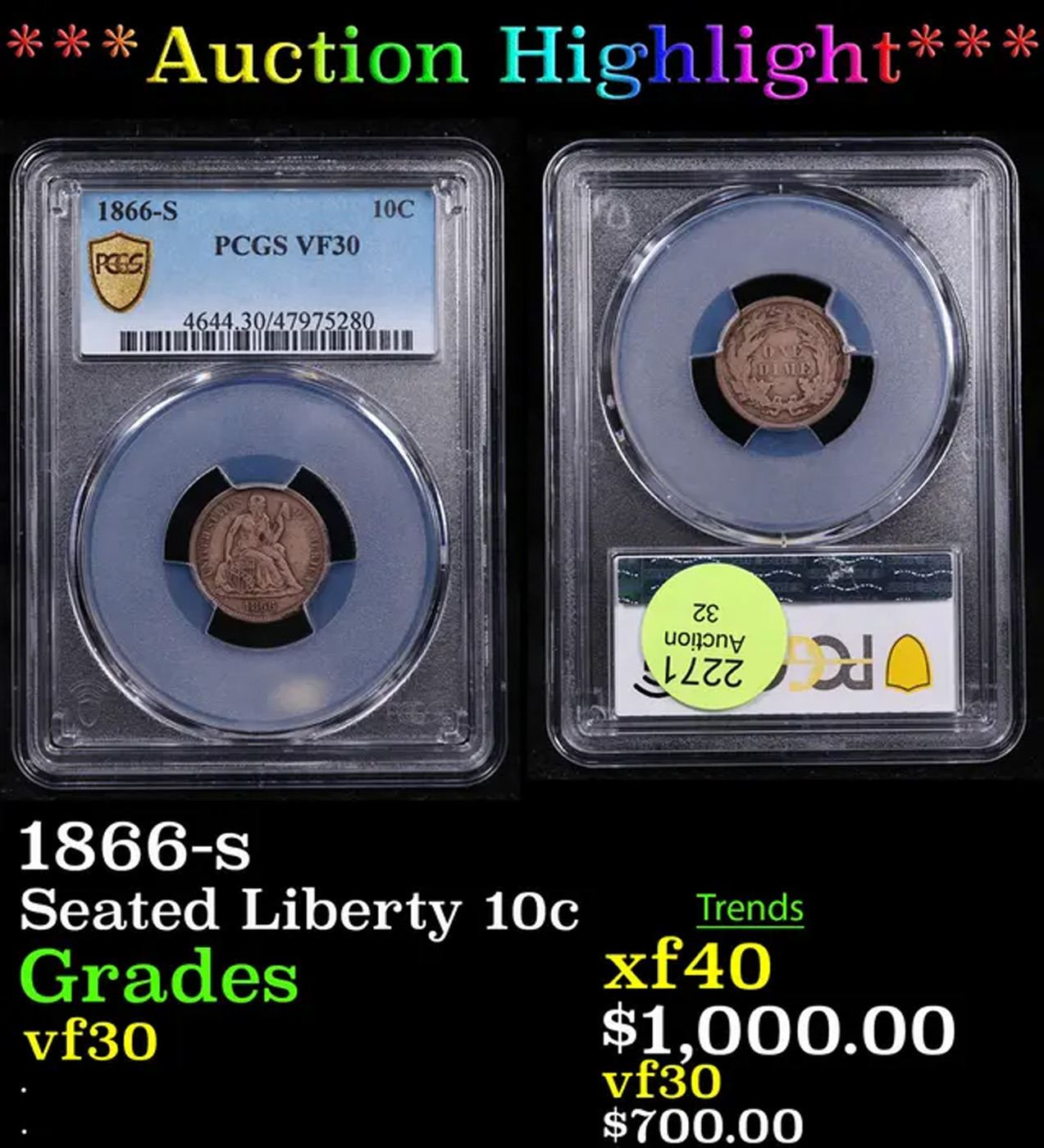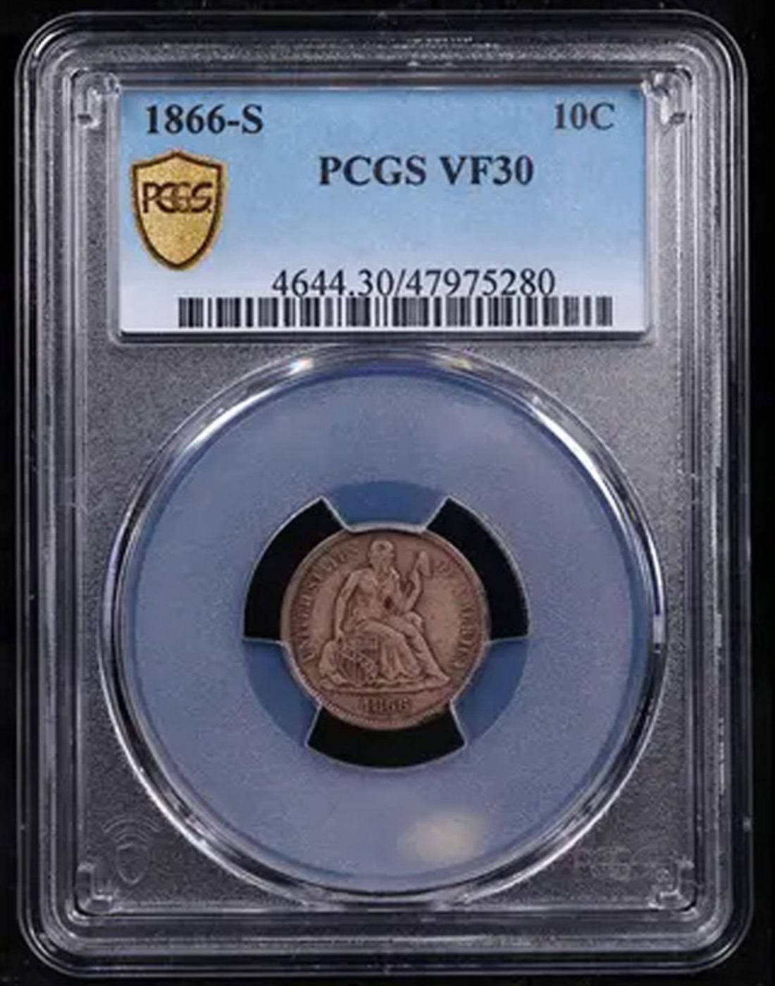 ***Auction Highlight*** PCGS 1866-s Seated Liberty Dime 10c Graded vf30 By PCGS.