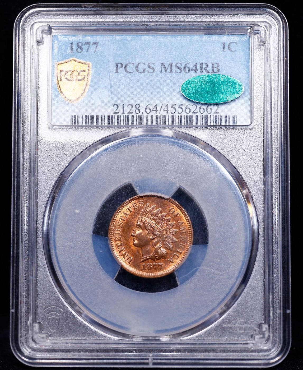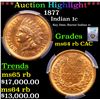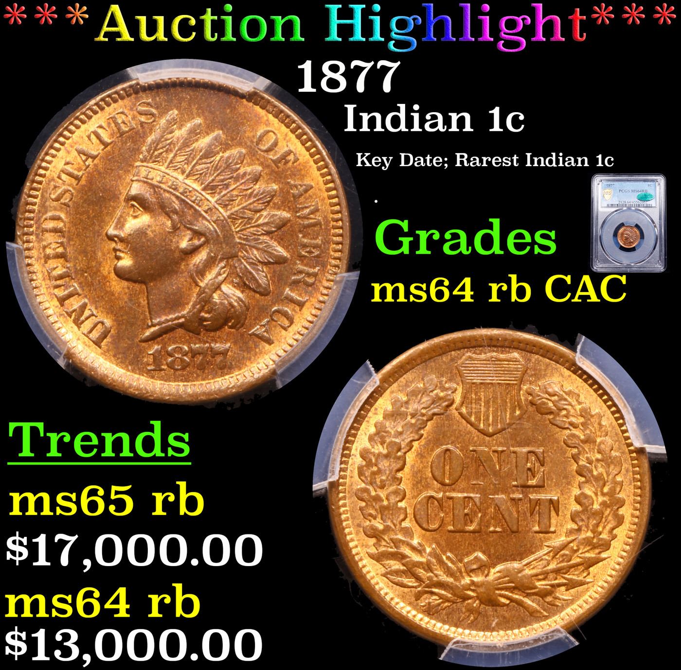 ***Auction Highlight*** PCGS 1877 Indian Cent 1c Graded ms64 rb CAC BY PCGS. The Key Date to the whole Indian Cent Series. According to Jaime Hernandez from PCGS, ‘The 1877 Indian Cent is unquestionably the most desirable coin in the entire circulation strike Indian Cent series. It is the second lowest mintage coin in the series, and only the 1909-S Indian cent has a lower mintage. Despite the 1877 Indian cent having the second lowest mintage in the series, it also survives in much smaller numbers than the 1909-S Indian cent. This is mainly due to the lack of coins being collected in 1877 compared to 1909. There is only one reverse die confirmed as striking all existing 1877 Indian cents. However, if there was only one reverse die employed to strike all (877,000)1877 Indian cents, then this lone die should have sustained major planchet flaws when striking such a large mintage. Surprisingly, this is not the case since 1877 cents show no traces of a damaged die. Therefore, it is strongly believed that the mintage of 877,000 coins struck, is actually a highly inflated figure. Offered is a rare and highly desirable Choice Red and Brown example of the famous key date 1877 Indian cent. Highly lustrous with a satiny texture, both sides retain plenty of original mint color in soft golden-orange. Blushes of light olive-brown patina are also noted, in keeping with the color designation assigned by PCGS. Striking detail is universally sharp throughout, a rare attribute for an issue that is often seen with softness in one or more peripheral areas. Surface preservation is just as superior as striking quality for the issue, and fully deserving of the Choice grade from PCGS.With just 852,500 pieces produced, the 1877 has the lowest mintage among circulation strike Indian cents after only the final year 1909-S (309,000). The 1877 is rarer than the 1909-S in all grades, however, because it was made during an era in which most collectors were content to obtain a Proof. As a result, circulation strike 1877 cents were generally overlooked in their day, and most found their way into commerce, which generally meant several years of recycling between the Mint and banks.Although popular during the Civil War and early Reconstruction eras when silver and gold coins had disappeared from circulation in the East and Midwest, by the 1870s large quantities of bronze cents had begun to accumulate in banks as public demand for them waned. Through the Act of March 3, 1871, Congress authorized the Mint to redeem these bronze cents (along with copper and nickel coins), melt them, and use the metal retrieved to strike new coins. In 1874 the Mint modified this practice by simply reissuing the redeemed coins alongside whatever newly struck examples were required to meet demand. In 1877, a depression year, the Philadelphia Mint redeemed an unusually large number of bronze cents - 9,908,148 coins (per Rick Snow, 2014) - and reissued 9,821,500 coins, largely meeting demand. Relatively few new coins were required, explaining the small mintage for the circulation strike 1877 Indian cent.This issue is eagerly sought in all grades, both circulated and Mint State. The present example with CAC approval is a notable condition rarity that numbers among the leading Indian cent highlights offered in our recent sales. A Key Date's Pick, Bid to Win, Don't let it get Away, you might not find its equal Coin. I give this coin my highest recommendation