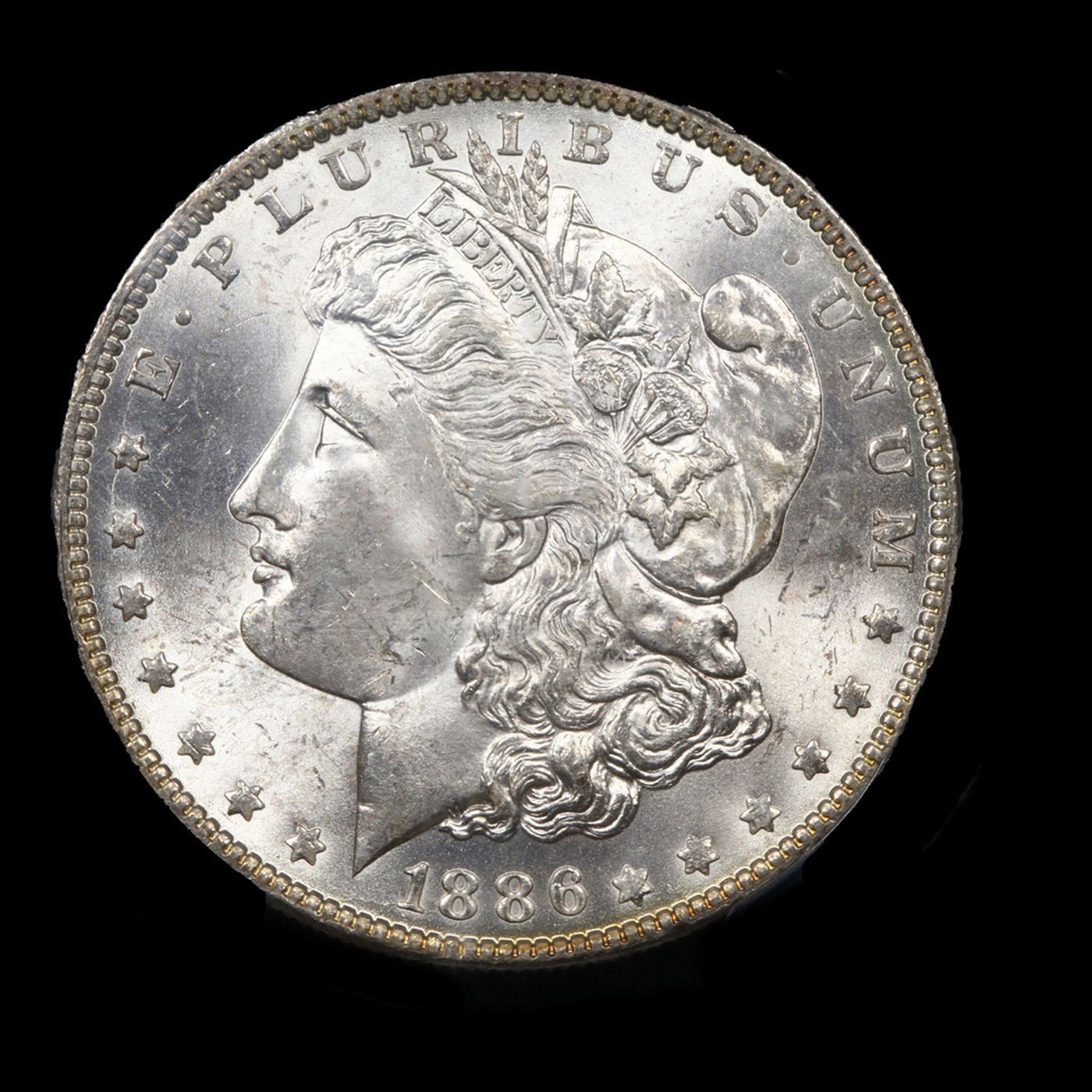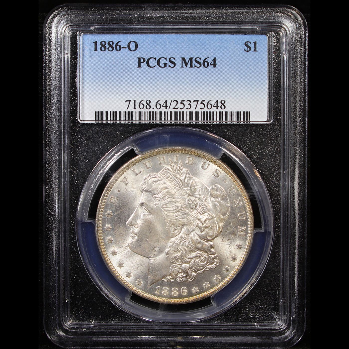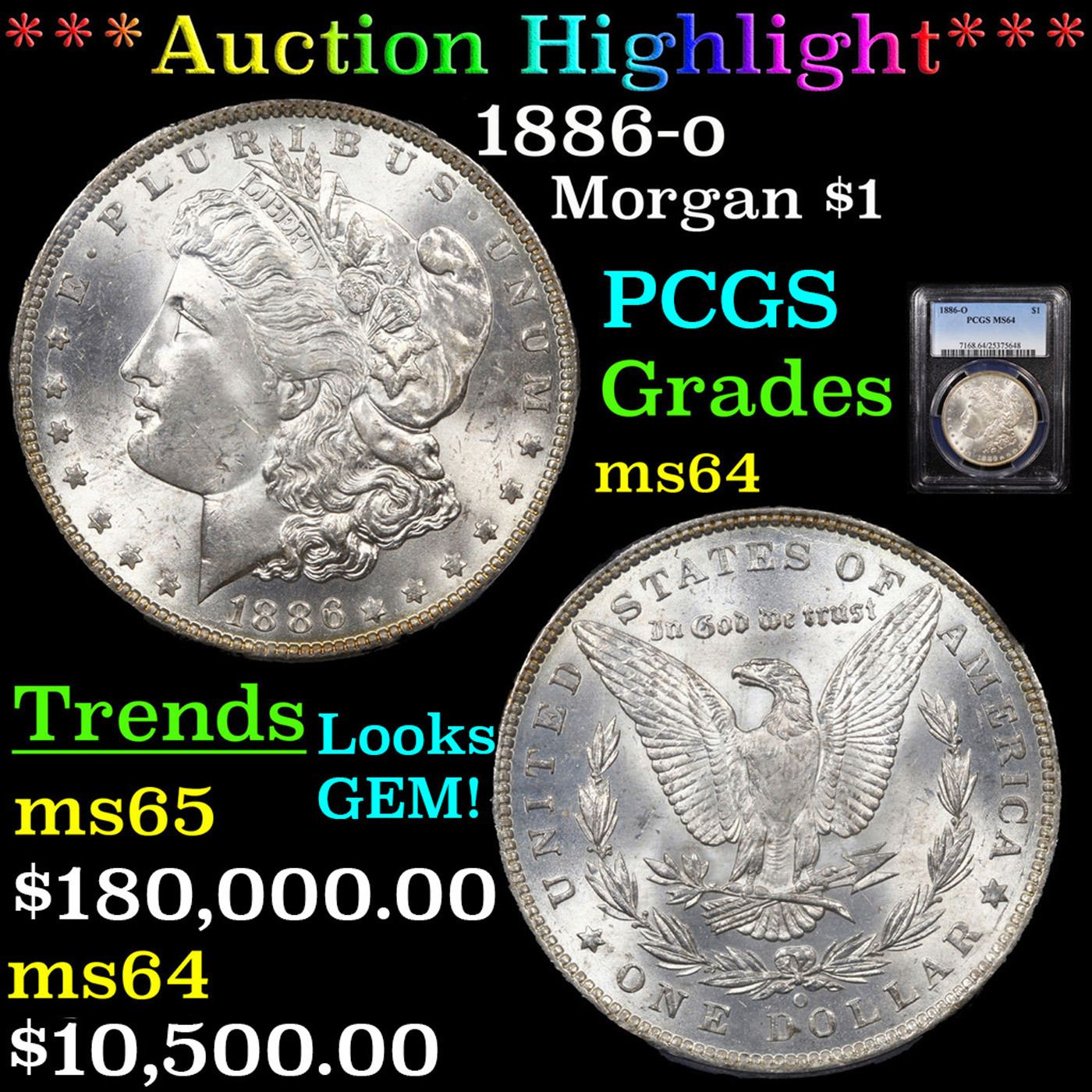 ***Auction Highlight*** PCGS 1886-o Morgan Dollar 1 Graded ms64 By PCGS. HIGHLIGHT OF THE AUCTION – This ms64 Look ms65. Trends on ms65 are $180,000! This is an outstanding, high end MS-64 to represent the conditionally challenging 1886-O silver dollar. Sharply struck with fulsome mint luster, both sides also possess a brilliant silver white appearance. Illustrative of one of the situations that make the Morgan dollar series so appealing to numismatists, this issue is far scarcer in Mint State than the 1883-O, 1884-O and 1885-O despite having a higher mintage (10,710,000 coins for the 1886-O as opposed to, for example, 9,185,000 pieces for the 1885-O). Given that the 1886-O is plentiful in worn condition, millions of examples likely found their way into circulation beginning in the late 19th century. Millions more, probably more than half of the mintage, were almost certainly kept in storage until melted under the terms of the 1918 Pittman Act. Today the conditionally challenging nature of this New Orleans Mint issue is well known, as is the prevalence of poorly struck coins among the relatively few Uncirculated survivors. Exceptionally well produced and preserved, the premium quality example offered here is sure to see spirited bidding. A Corey's Pick, Bid to Win, Don't let it get Away, you might not find its equal Coin. I give this coin my highest recommendation
