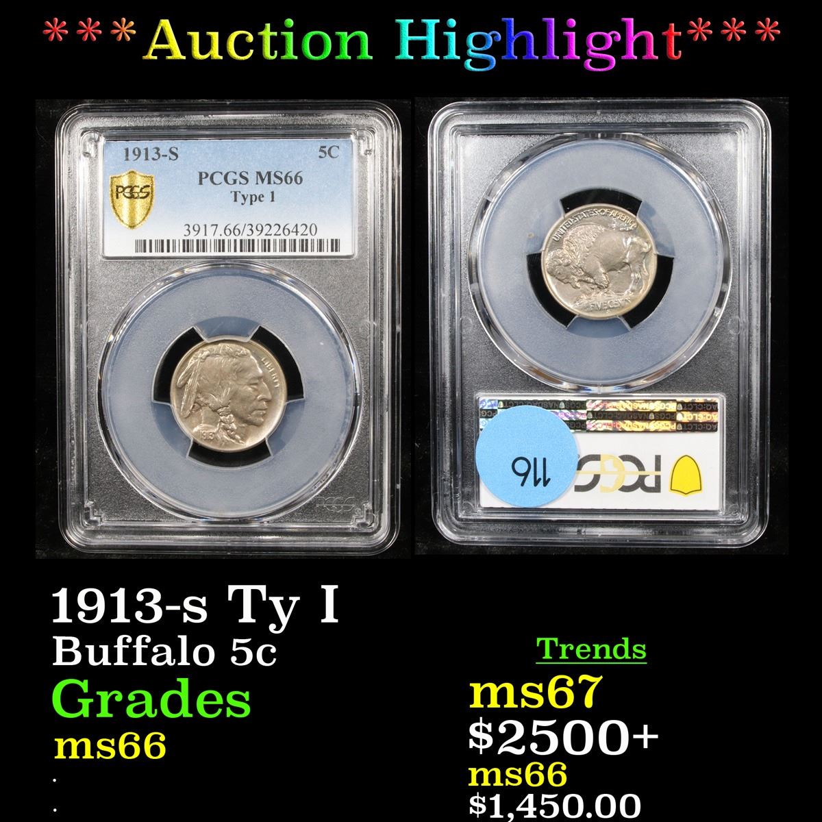 ***Auction Highlight*** PCGS 1913-s Ty I Buffalo Nickel 5c Graded ms66 By PCGS. A Corey's Pick, Bid to Win, Don't let it get Away Coin