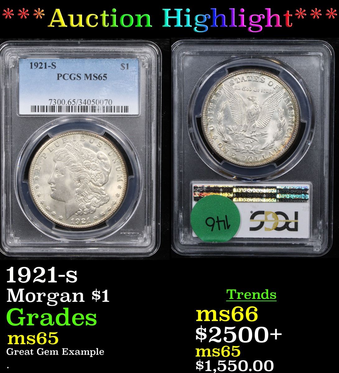 ***Auction Highlight*** PCGS 1921-s Morgan Dollar $1 Graded ms65 By PCGS. A Corey's Pick, Bid to Win, Don't let it get Away, you might not find its equal Coin. I give this coin my highest recommendation