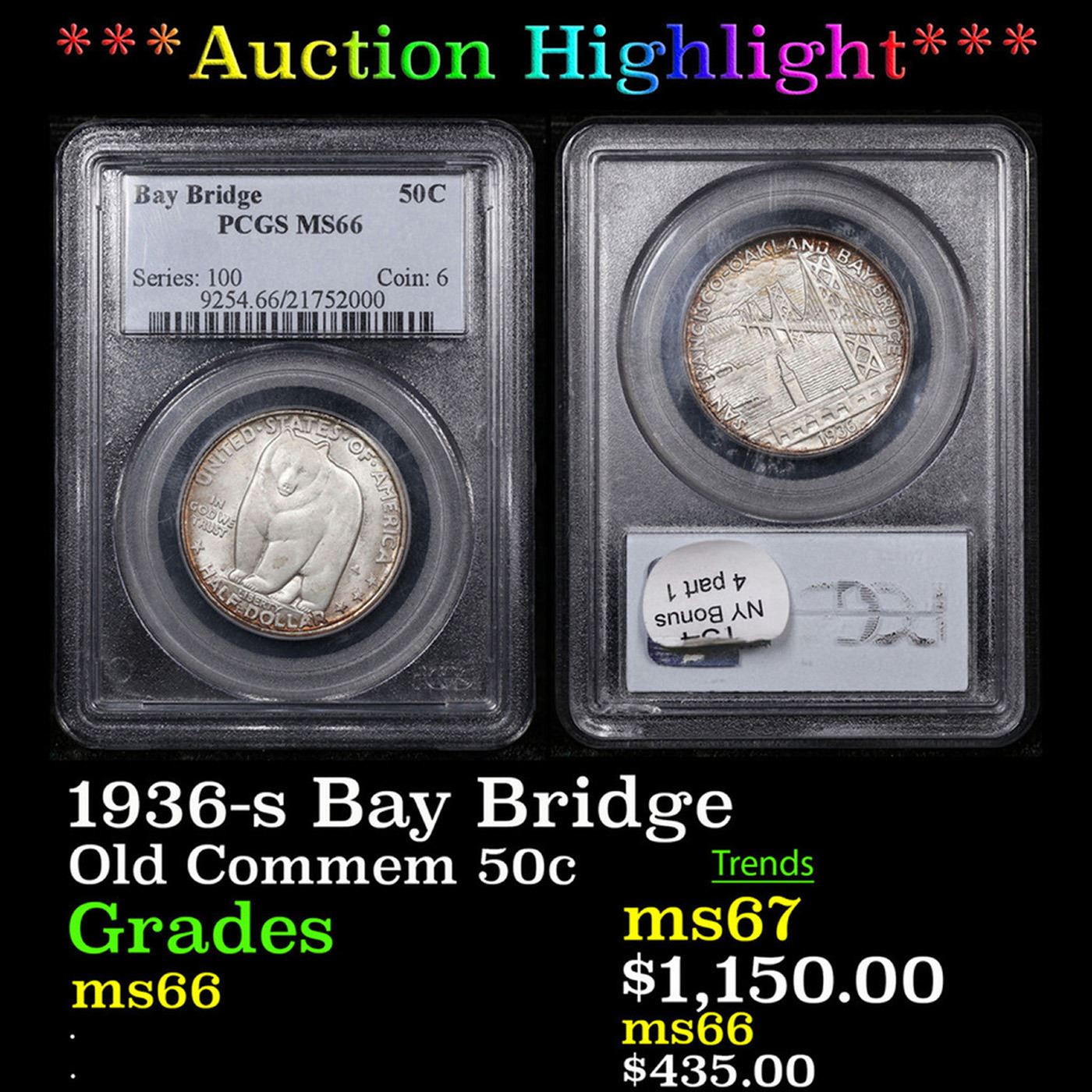 ***Auction Highlight*** PCGS 1936-s Bay Bridge Old Commem Half Dollar 50c Graded ms66 By PCGS. The opening of the San Francisco-Oakland Bay Bridge was commemorated with the issuance of a silver half dollar. Commonly referred to as the Bay Bridge Half Dollar, the issue proved to be one of the most popular from the plethora of commemorative coins released during the same year.The coins were designed by San Francisco artist Jacques Schnier. The obverse features a grizzly bear, as a symbol of California, in three-quarter view. The reverse design depicts the Bay Bridge, with Ferry Tower in the foreground, Yerba Buena Island and East Bay Hills in the distance. The design is intriguing in the virtual lack of any completely smooth fields. Both the water and sky are presented in a modernistic pattern. The maximum authorized mintage for the issue was 200,000 pieces. The Coin Committee of the San Francisco-Oakland Bay Bridge Celebration ordered 100,000 coins and indicated that it was their intention to only issue this amount. Coins were struck at the San Francisco Mint.Sales took place at a cost of $1.50 per coin by mail and through the booths at the bridge entrances where people could drive-up to buy the coins.In 1937, sales were ended and an unsold quantity of 28,631 coins were melted. This resulted in a net distribution of 71,424 pieces for the 1936 Bay Bridge Half Dollar.Because of the unique design, the obverse is more prone to displaying contact marks and abrasions. The complex and intricate design of the reverse tends to protect or obscure any such marks. A Corey's Pick, Bid to Win Coin