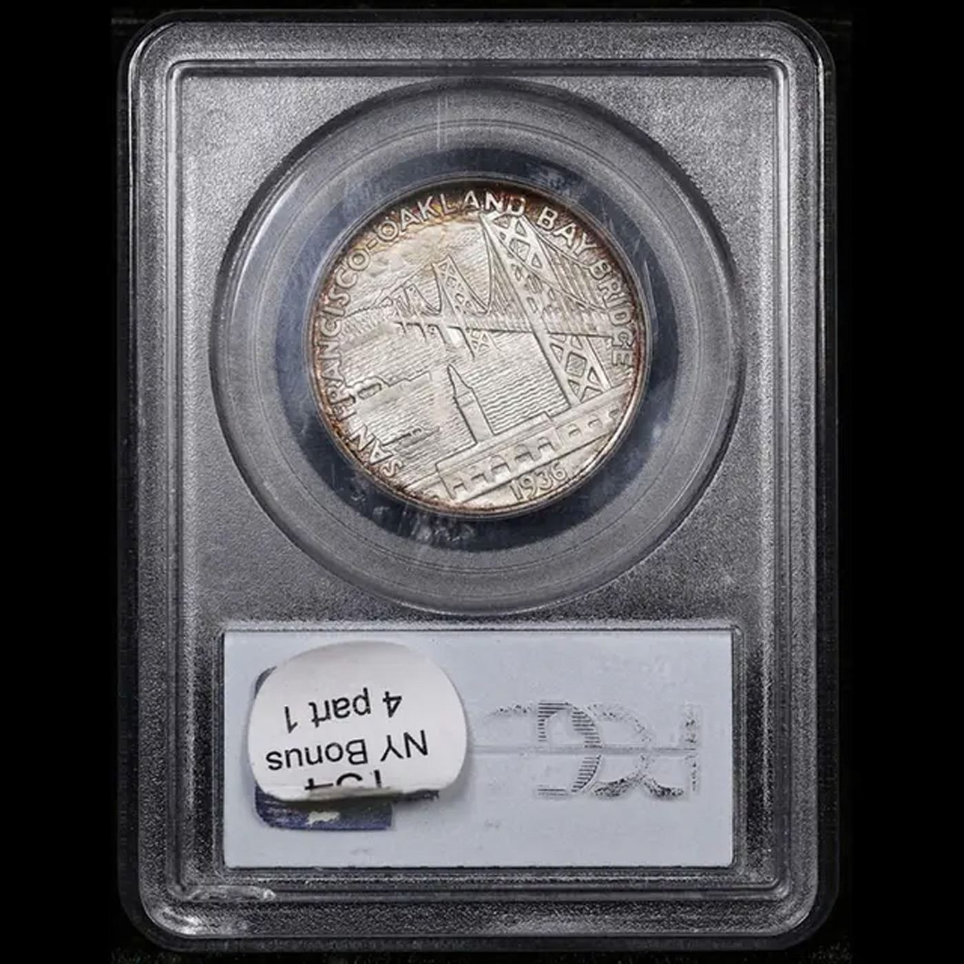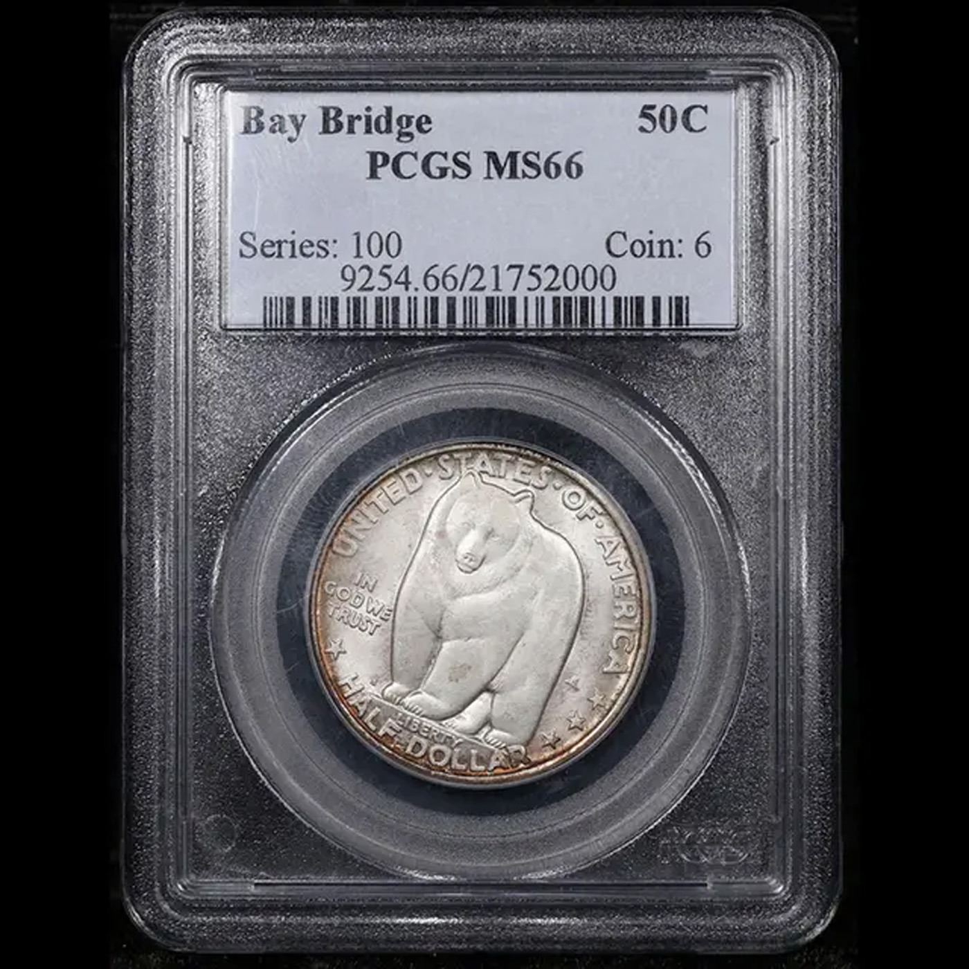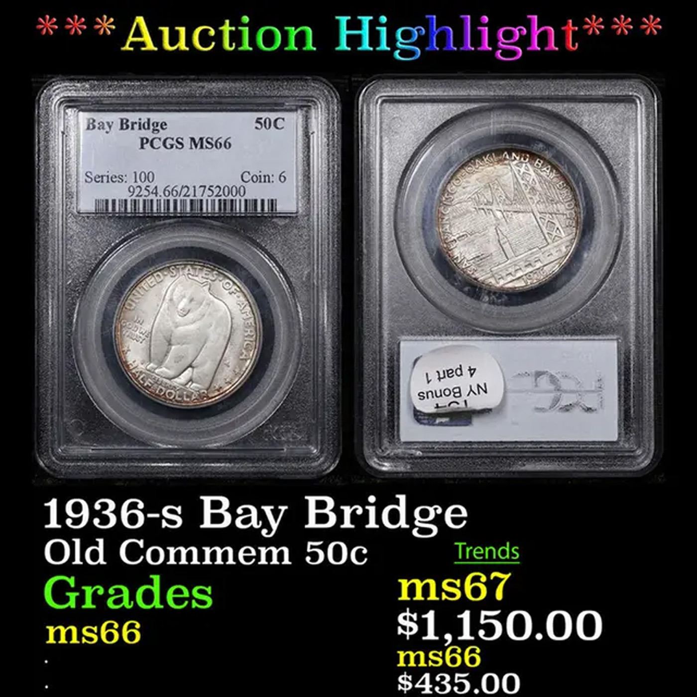***Auction Highlight*** PCGS 1936-s Bay Bridge Old Commem Half Dollar 50c Graded ms66 By PCGS. The opening of the San Francisco-Oakland Bay Bridge was commemorated with the issuance of a silver half dollar. Commonly referred to as the Bay Bridge Half Dollar, the issue proved to be one of the most popular from the plethora of commemorative coins released during the same year.The coins were designed by San Francisco artist Jacques Schnier. The obverse features a grizzly bear, as a symbol of California, in three-quarter view. The reverse design depicts the Bay Bridge, with Ferry Tower in the foreground, Yerba Buena Island and East Bay Hills in the distance. The design is intriguing in the virtual lack of any completely smooth fields. Both the water and sky are presented in a modernistic pattern. The maximum authorized mintage for the issue was 200,000 pieces. The Coin Committee of the San Francisco-Oakland Bay Bridge Celebration ordered 100,000 coins and indicated that it was their intention to only issue this amount. Coins were struck at the San Francisco Mint.Sales took place at a cost of $1.50 per coin by mail and through the booths at the bridge entrances where people could drive-up to buy the coins.In 1937, sales were ended and an unsold quantity of 28,631 coins were melted. This resulted in a net distribution of 71,424 pieces for the 1936 Bay Bridge Half Dollar.Because of the unique design, the obverse is more prone to displaying contact marks and abrasions. The complex and intricate design of the reverse tends to protect or obscure any such marks. A Key Date's Pick, Bid to Win Coin