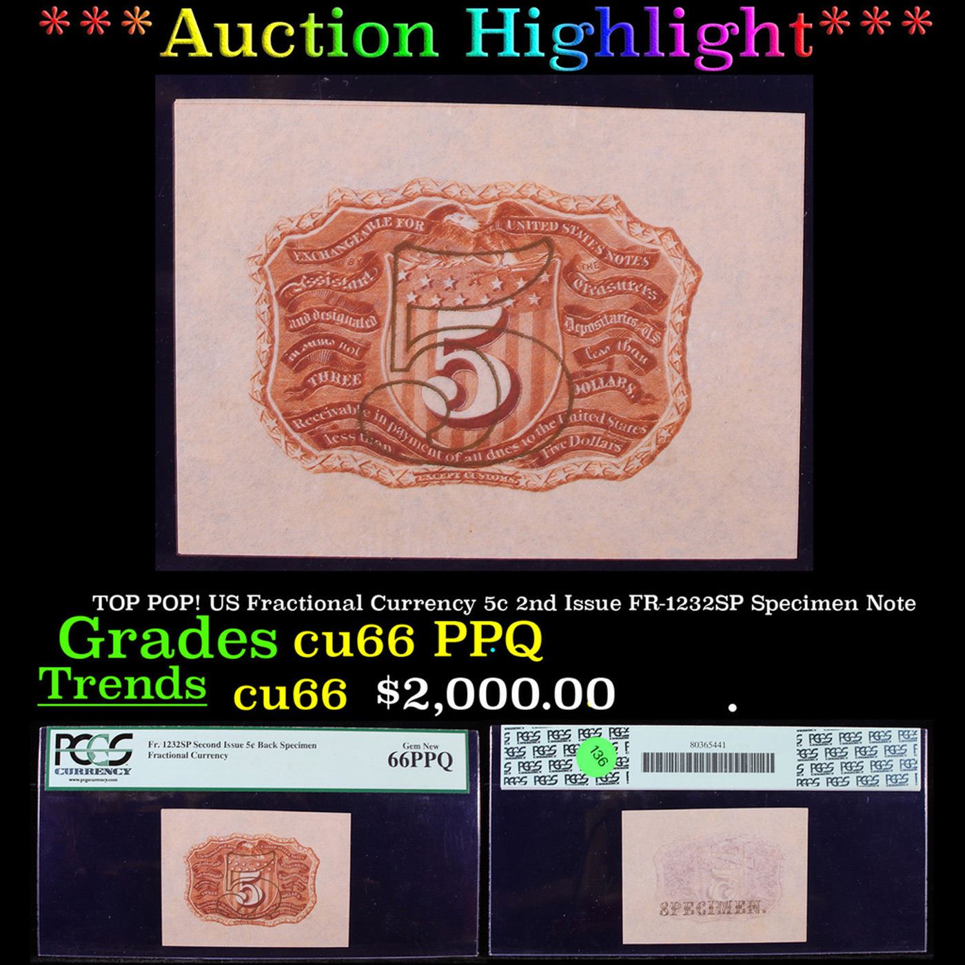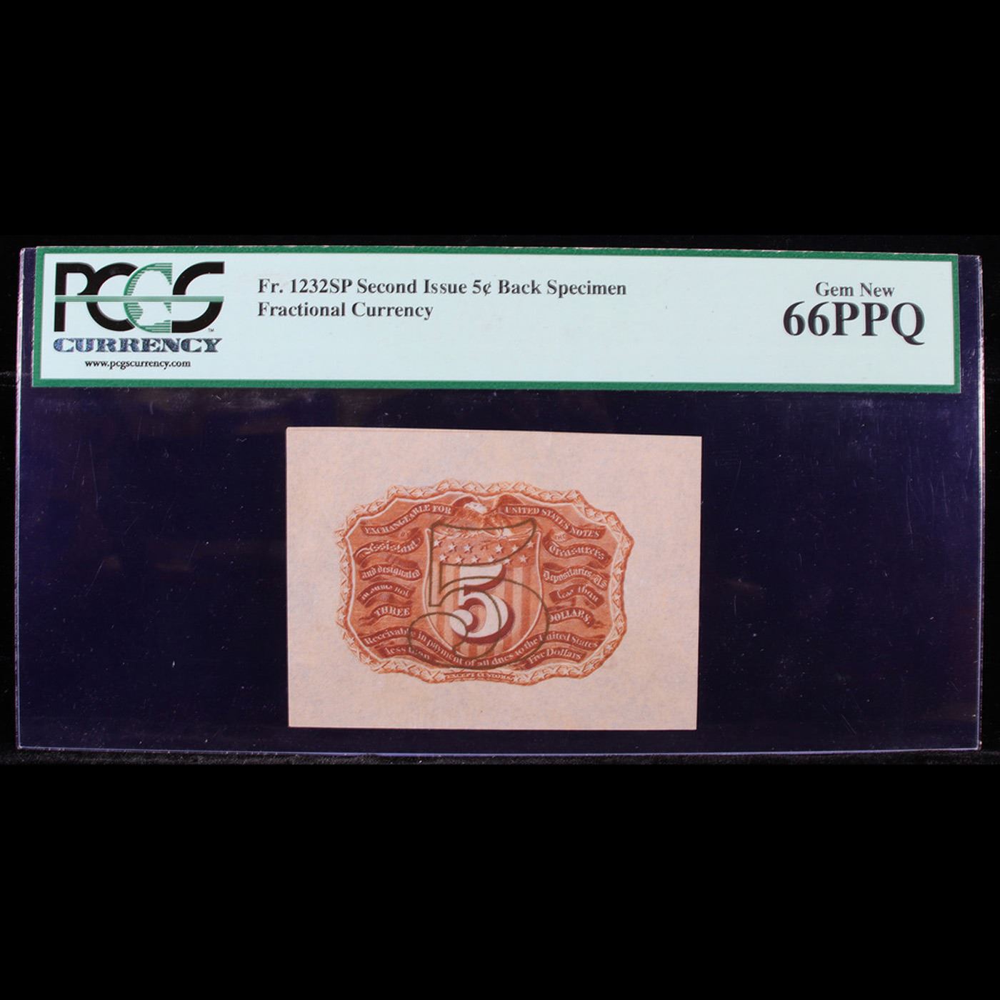 ***Auction Highlight*** PCGS TOP POP! US Fractional Currency 5c 2nd Issue FR-1332SP Specimen Note Graded cu66 PPQ By PCGS. Fractional or postage currency has a rich history. At the beginning of the Civil War people starting hoarding coins for their precious metal content. Coins became difficult to find because of the hoarding. People started to try to use stamps instead of coins as a means of commerce. The government decided to help ease the hoarding issue by issuing “paper coins” also known as postage currency or fractional currency. Fractional currency was first issued on August 21, 1862 and they were last issued on February 15, 1876. Three cents, five cents, ten cents, twenty-five cents, and fifty cents notes were all issued. Fractional currency is physically smaller than other United States money. It also does not have a serial number.