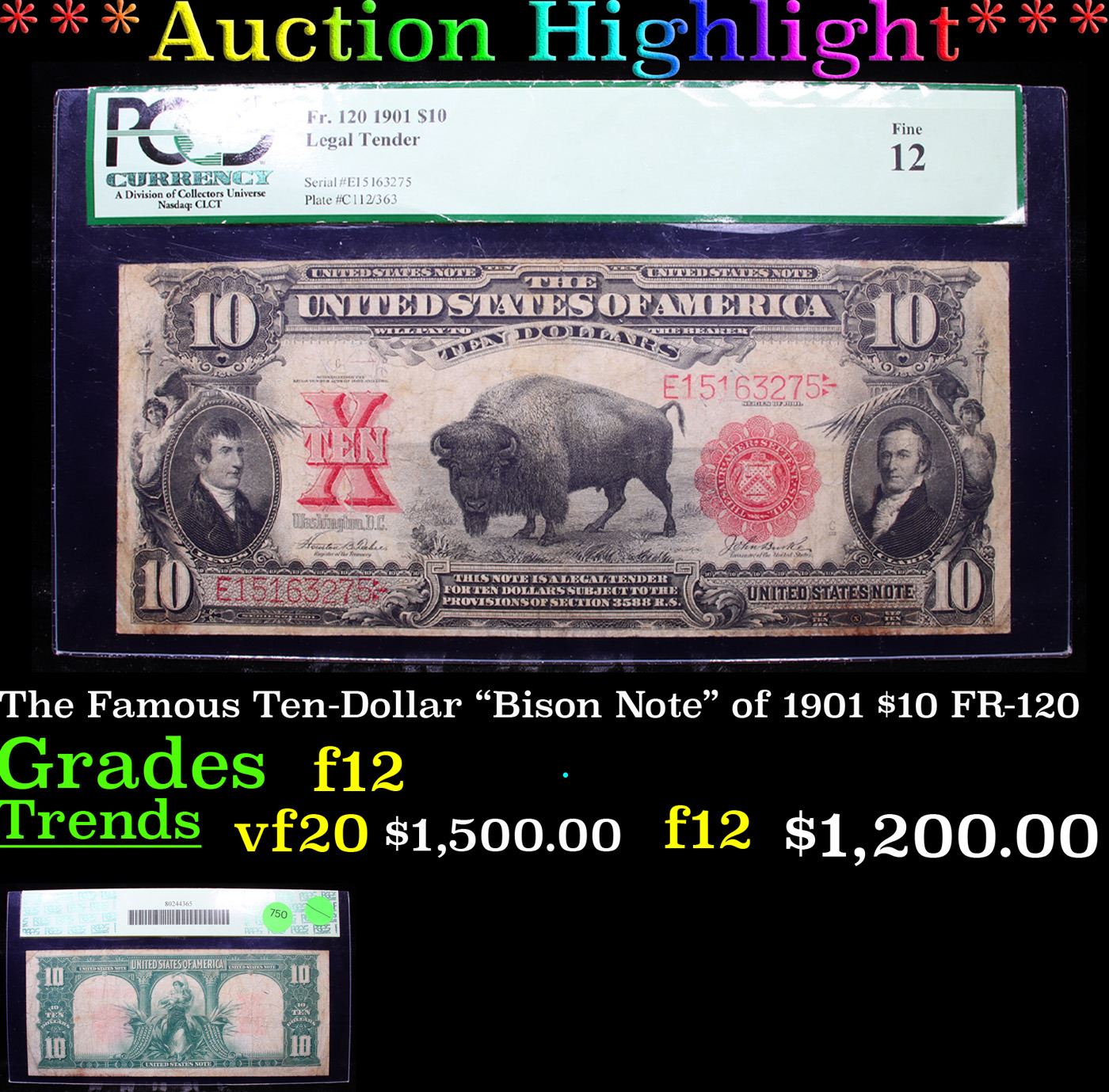 ***Auction Highlight*** PCGS The Famous Ten-Dollar "Bison Note" of 1901 $10 FR-120 Graded f12 By PCGS. One of the most sought-after notes in the world. The Series 1901 $10 Legal Tender Note symbolizes the spirit of our frontier past with a beautifully engraved image of a powerful bison. With its massive size, prominent head and shaggy fur, the giant of the Great Plains captivated settlers and became a legendary fixture in the American imagination. Issued at the dawn of the last century. Flanking the bison are vignettes of explorers Lewis and Clark, whose mapping of the Louisiana Purchase territory paved the way for western expansion. The reverse features Columbia, a poetic female personification of the U.S. This rarely seen “legal tender note” is full of intricate flourishes and distinguished by a rich red seal and serial number.
