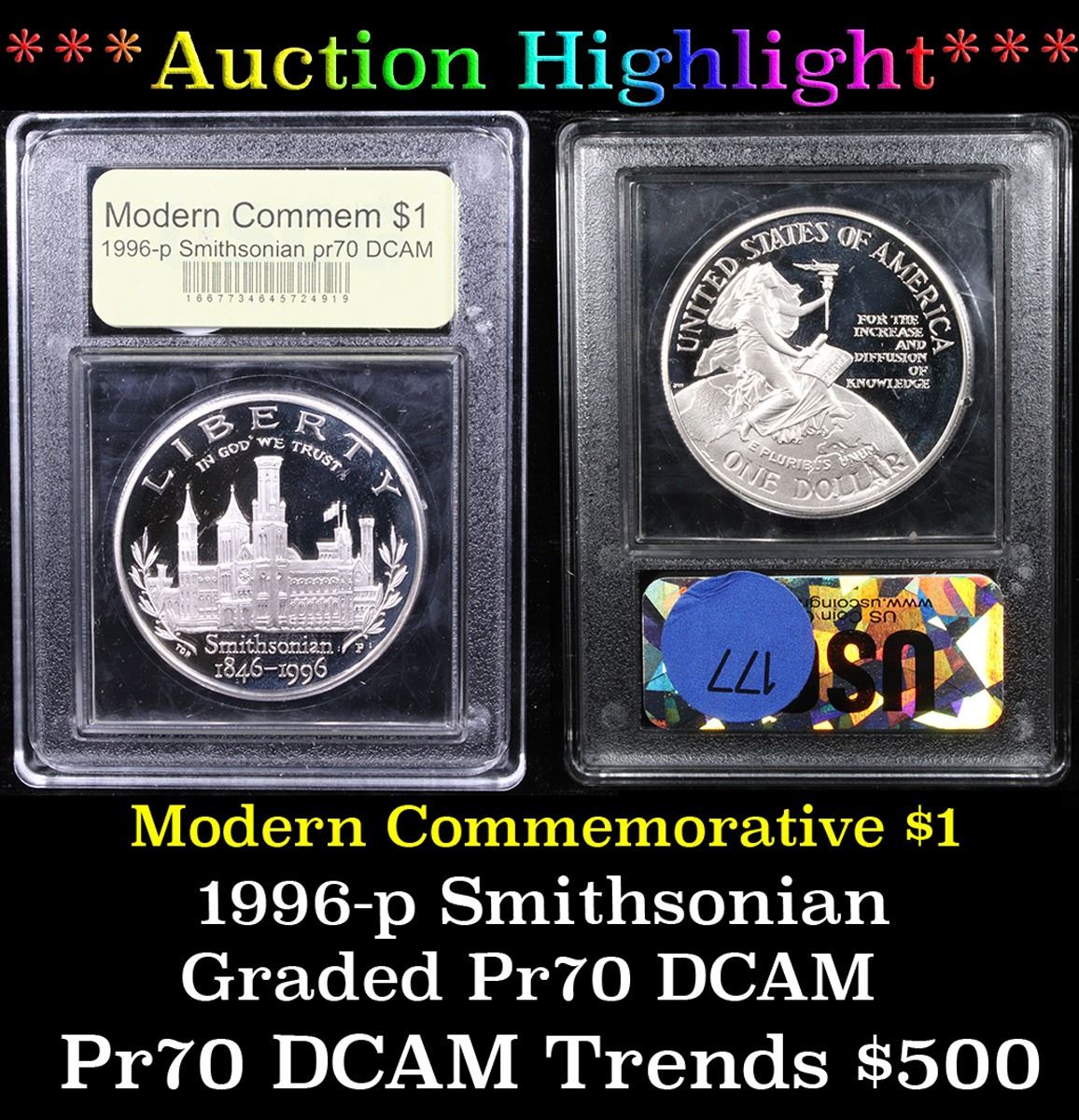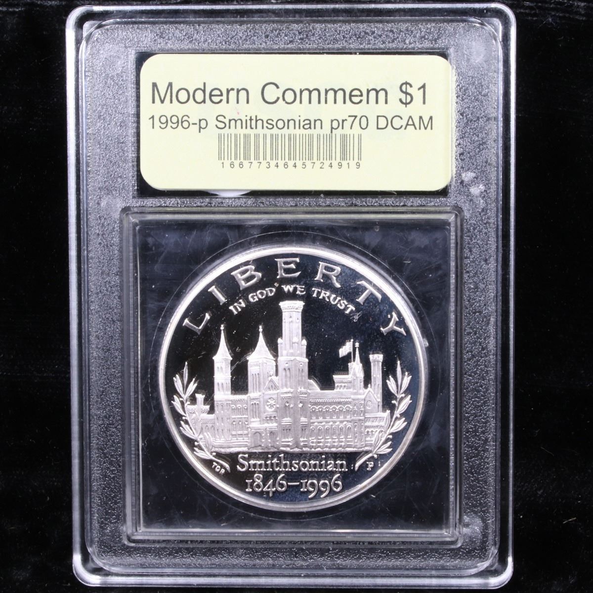 ***Auction Highlight*** 1996-P Smithsonian Institution Modern Commem Dollar $1 Graded GEM++ Proof Deep Cameo By USCG. The 1996 Smithsonian 150th Anniversary Silver Dollar was issued to commemorate the establishment of the Smithsonian Institution by Congress on August 10, 1846. Encapsulated and graded PR70 DCAM by USCG. A lower mintage and more expensive issue.