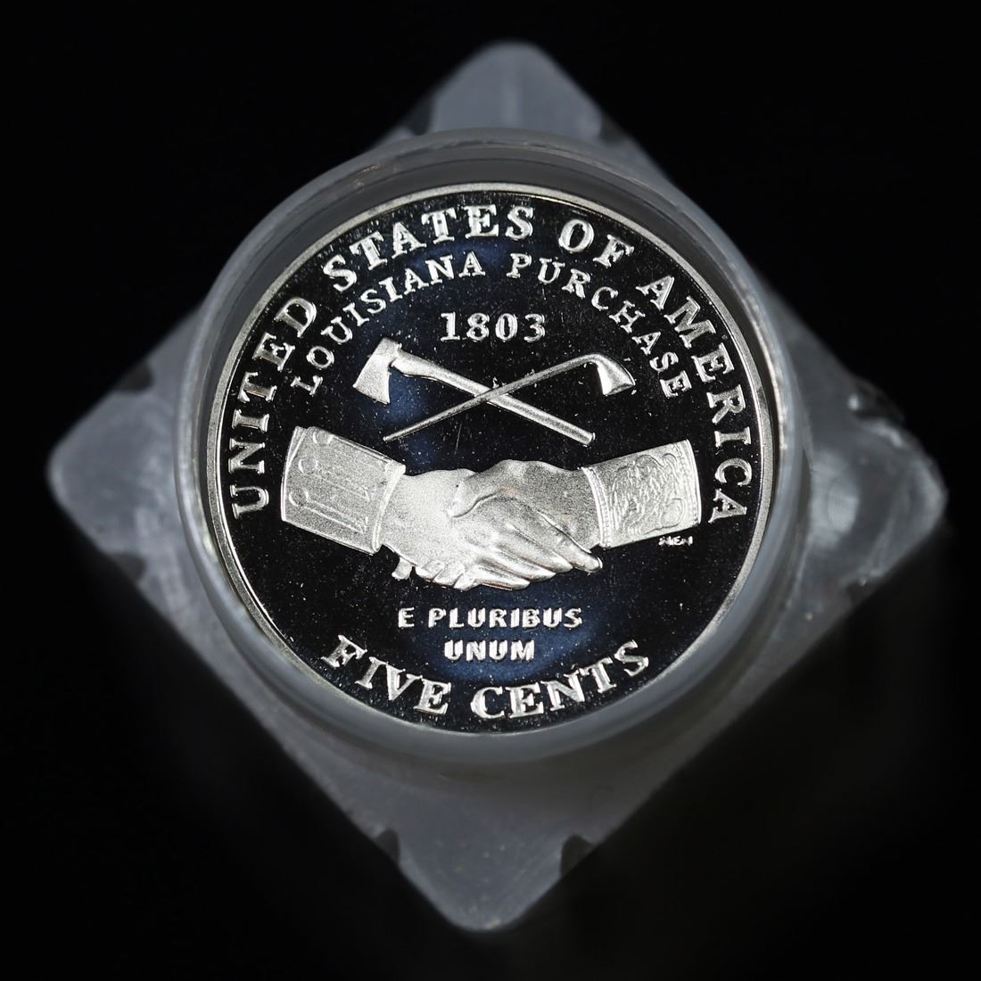 ***Auction Highlight*** Proof 2004-s Peace Medal reverse Jefferson nickel 5c roll, 40 pieces. A great proof roll of Jefferson nickels. All coins are deep cameo. In pr66dcam trends $6/coin, and in pr65dcam $5/coin. $200.