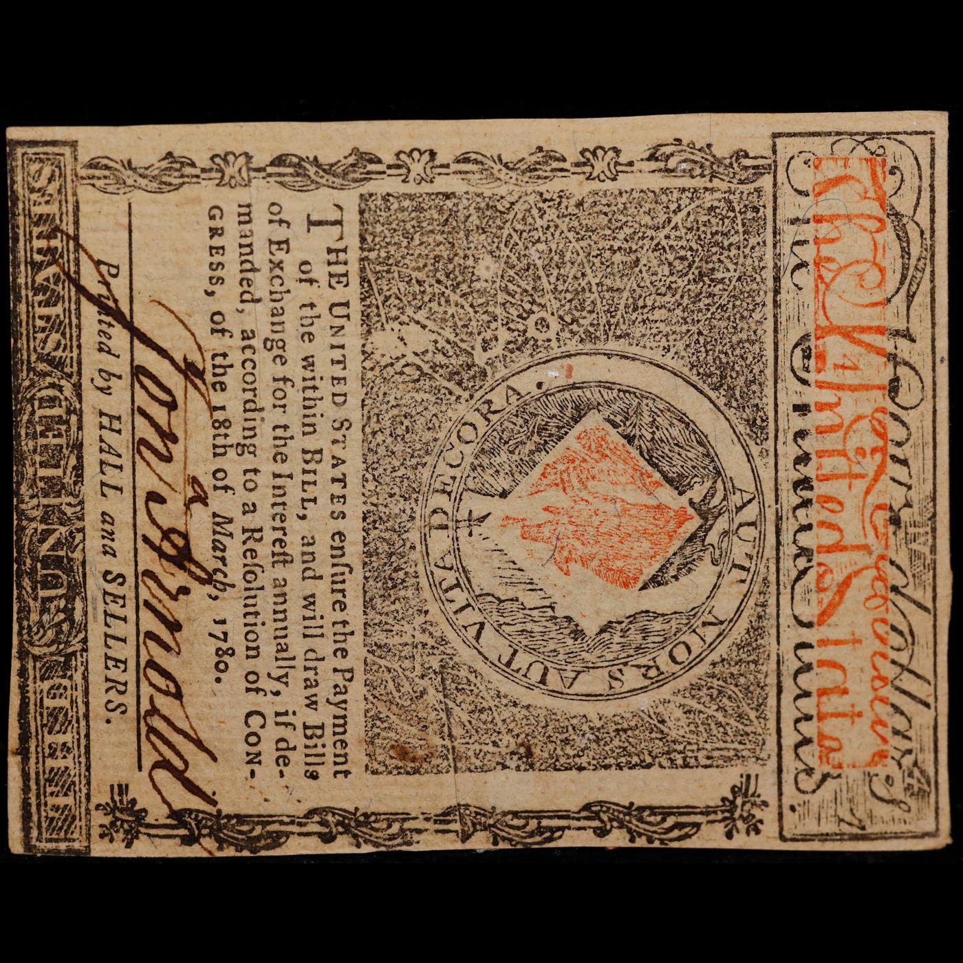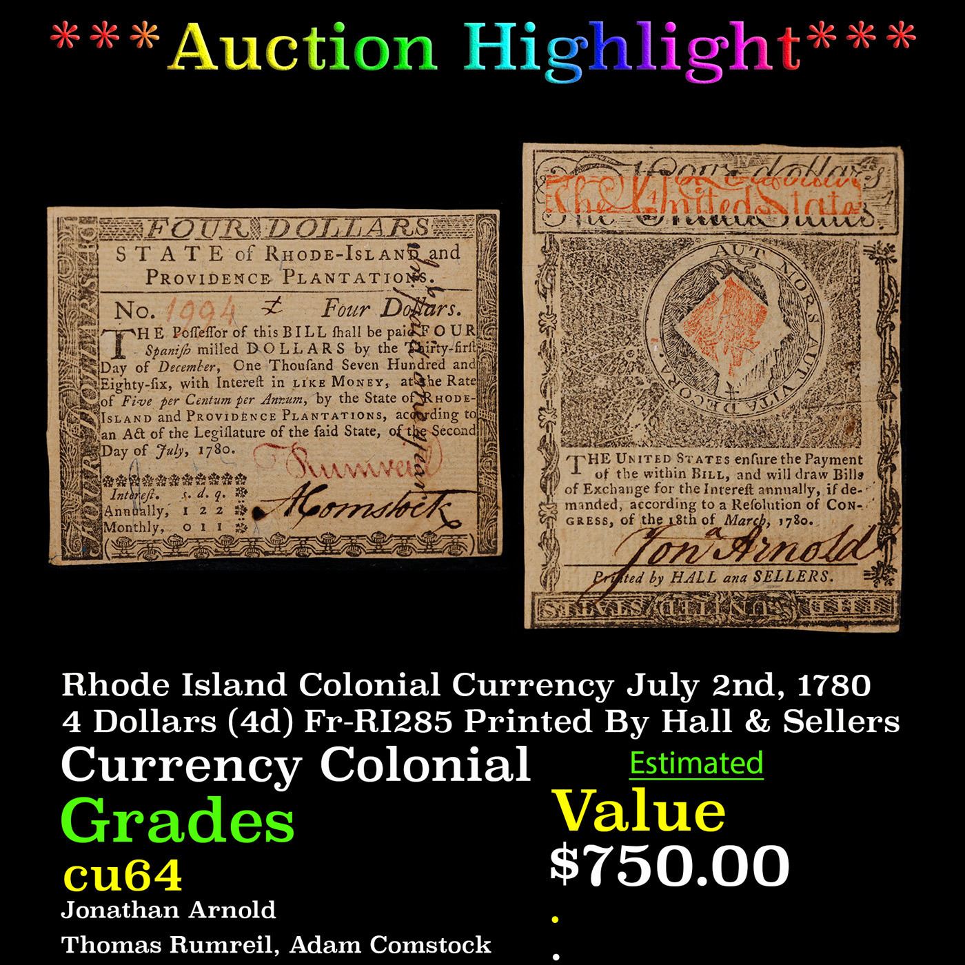 ***Auction Highlight*** Rhode Island Colonial Currency July 2nd, 1780 4 Dollars (4d) Fr-RI285 Printed By Hall & Sellers Grades Choice CU.