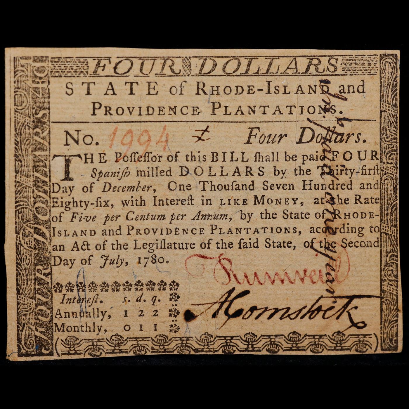 ***Auction Highlight*** Rhode Island Colonial Currency July 2nd, 1780 4 Dollars (4d) Fr-RI285 Printe