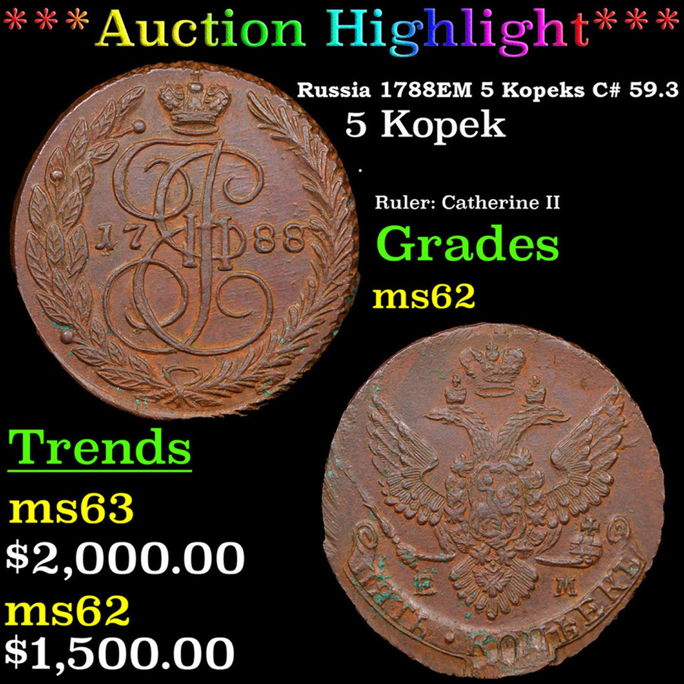 ***Auction Highlight*** Russia 1788?? 5 Kopeks C# 59.3 Grades Select Unc. About the Kopek, 100 Kopeks make 1 Ruble. To give an idea of the purchasing power of one of these in the 1790's one could purchase 50 apples for a Kopek, so these kopek pieces did have some nice buying power.The mintmarks available on these coins are:AM AnnenskEM EkaterinburgKM KolyvanMM MoscowCM Sestroretsk, Finland??? St. PetersburgTM Feodesia, CrimeaIn addition there a few years that pieces with no mint mark can be found. A Key Date's Pick, Bid to Win, Don't let it get Away Coin