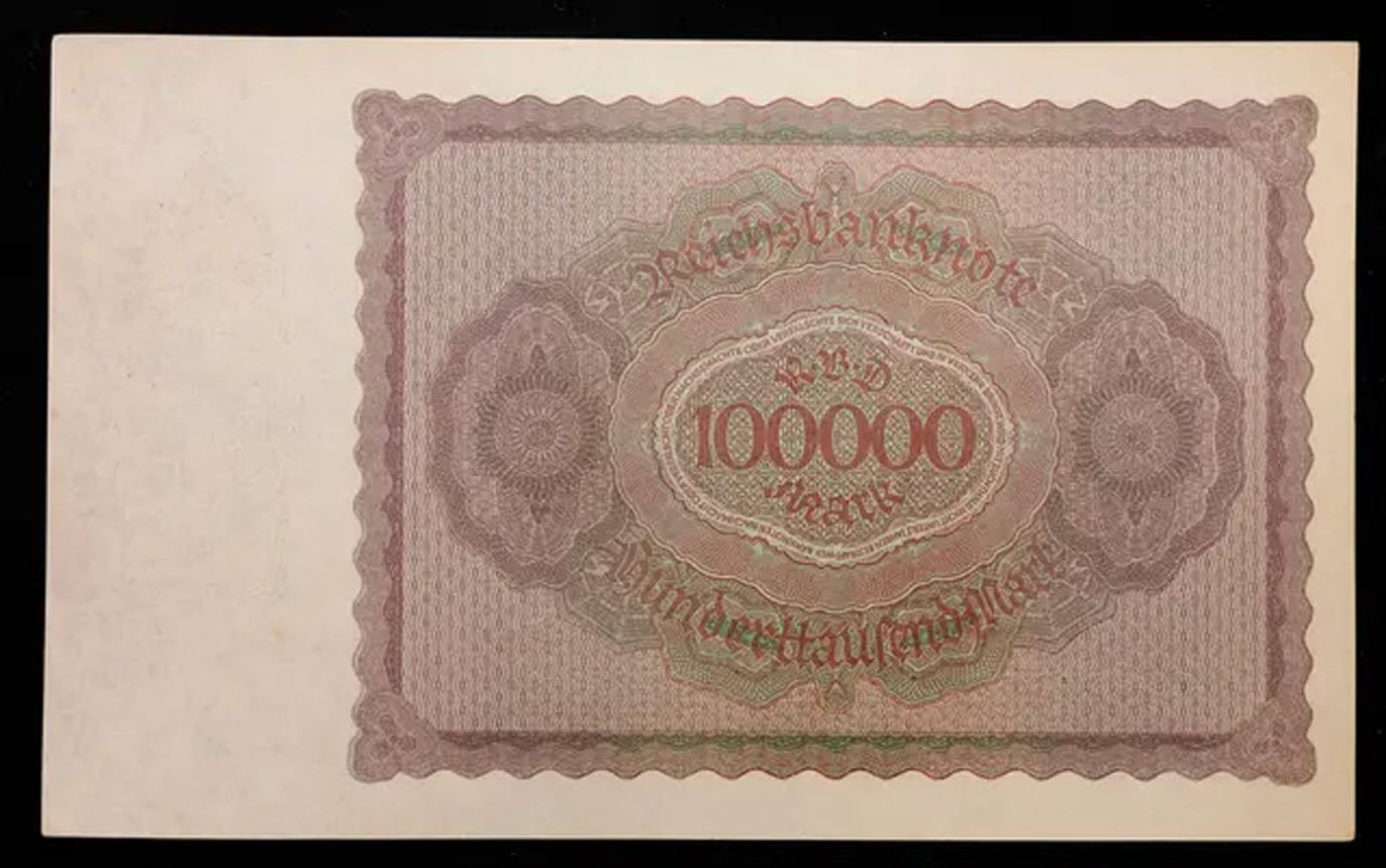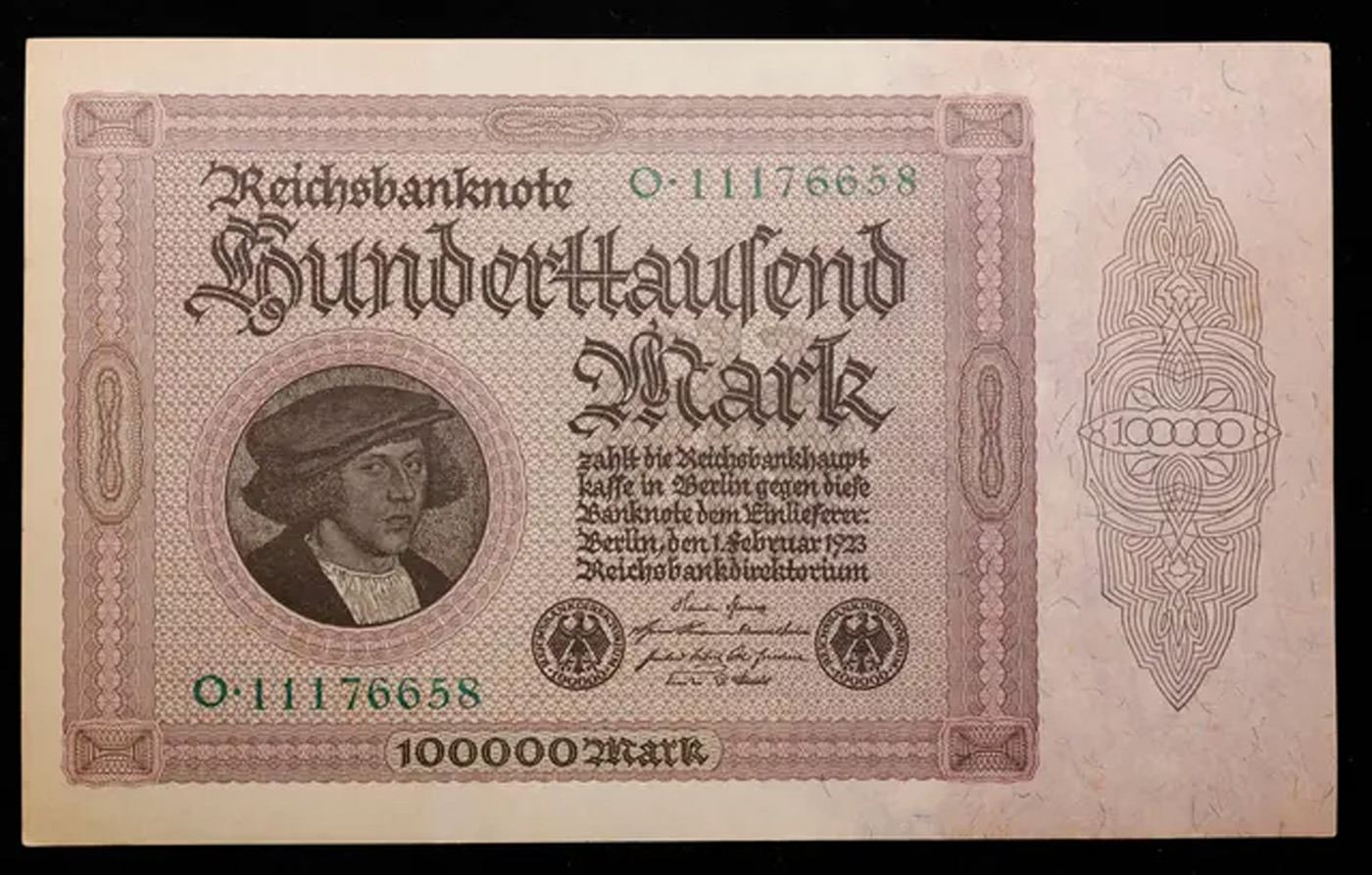 ***Auction Highlight*** Set of 20 1923 Weimar Germany 100,000 Mark Notes In Original Bank Wrapper Grades Gem CU. In the early 1920s, post-WWI Germany saw its economy spiraling out of control. Hyperinflation started directly after the war in 1918, but truly took over the Weimar Republic from 1921 to 1923. The value of the Mark declined incredibly rapidly. 1 USD was equal to 50 German Marks at the beginning of 1920. Toward the end of 1923, 1 USD was equal to over 4,200,000,000,000 German Marks. At times, denominations of the Mark became less valuable than the paper and labor to print it almost immediately after printing. Thus, denominations of the Mark notes became incredibly large, ending up in the tens of trillions.