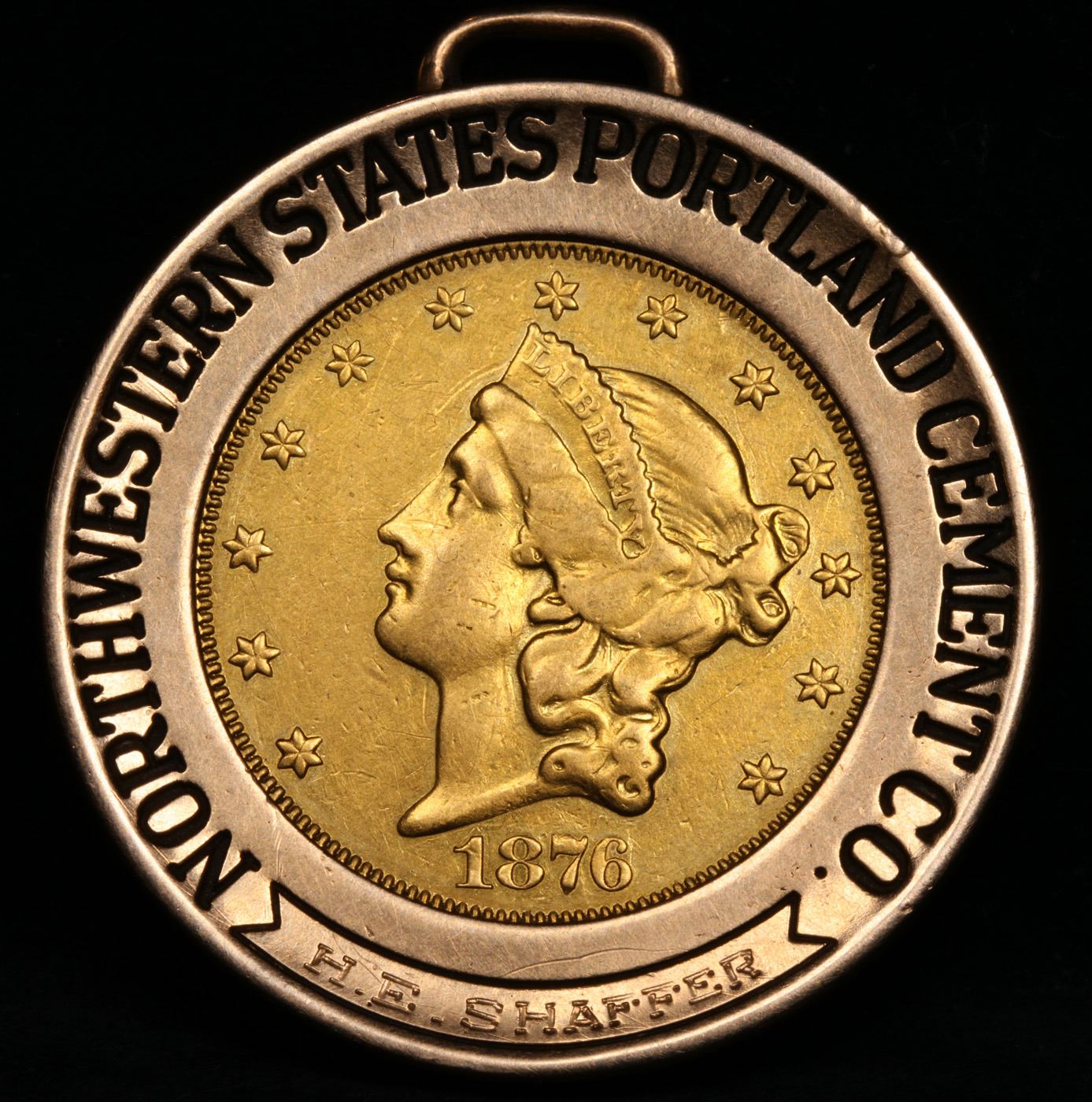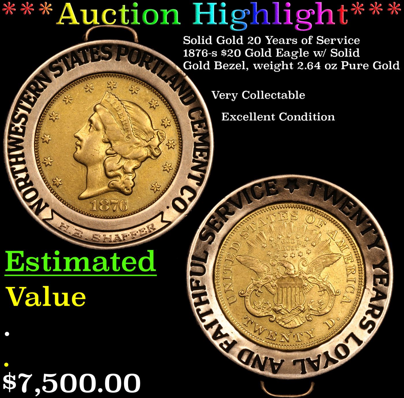 ***Auction Highlight*** Solid Gold 20 Years of Service 1876-s $20 Gold Eagle w/ Solid Gold Bezel, weight 2.64 oz Pure Gold. Up for auction is a Great piece of Ephemera, a Solid Gold Token of Twenty Years of Loyal and Faithful Service to the Northwestern States Portland Cememnt Company. It is a superbly manufactured and finely finished piece. It was presented to Mr. H.E. Shaffer. It is all solid gold, even the large Bezel. In the center is an 1876-s $20 Liberty Double Eagle. Surrounding it is a 19k gold bezel, which weighs 41.364g. The coin itself is 90% and it weighs 33.436g. The total pure Gold weight is 74.8 g. Or 2.64 Oz. At Today’s melt value of $1900 and ounce that makes the melt value of this wonderful piece $4940. A Corey's Pick, Bid to Win, Don't let it get Away, you might not find its equal Coin. I give this coin my highest recommendation