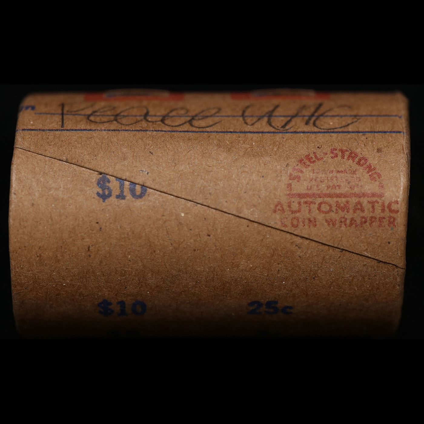 ***Auction Highlight*** Solid Uncirculated Peace silver dollar roll 1923 & P Ends, 20 coins. This roll is held in an old Steel strong wrapper, patented 1921, stamped "Bankers Trust Company of Philadelphia, Walnut Street at Juniper". This roll contains 20, Uncirculated Peace silver Dollars Any Date Or Mint Mark Is Possible Hand Marked Peace Unc. Based on the weight this is an uncirculated roll. We recently Acquired a large Estate Hoard of Uncirculated Rolls.