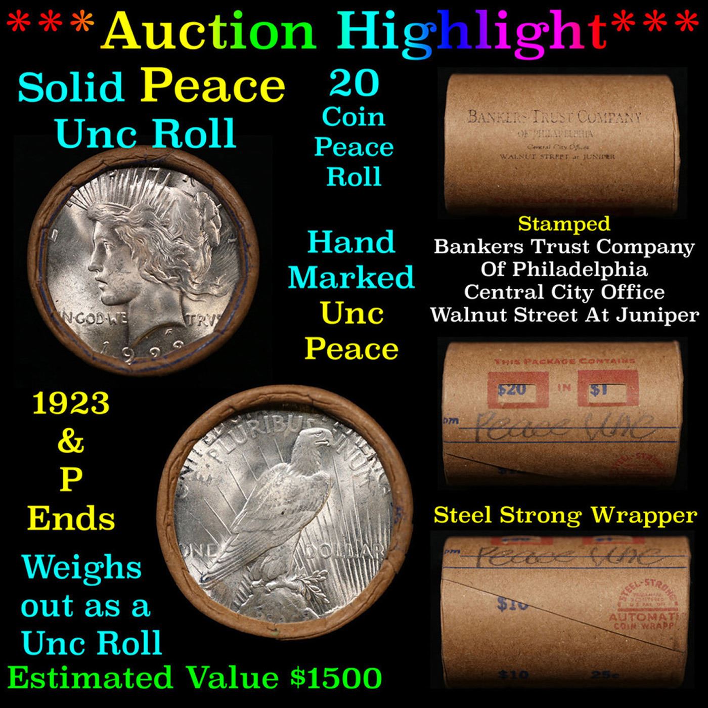 ***Auction Highlight*** Solid Uncirculated Peace silver dollar roll 1923 & P Ends, 20 coins (fc)