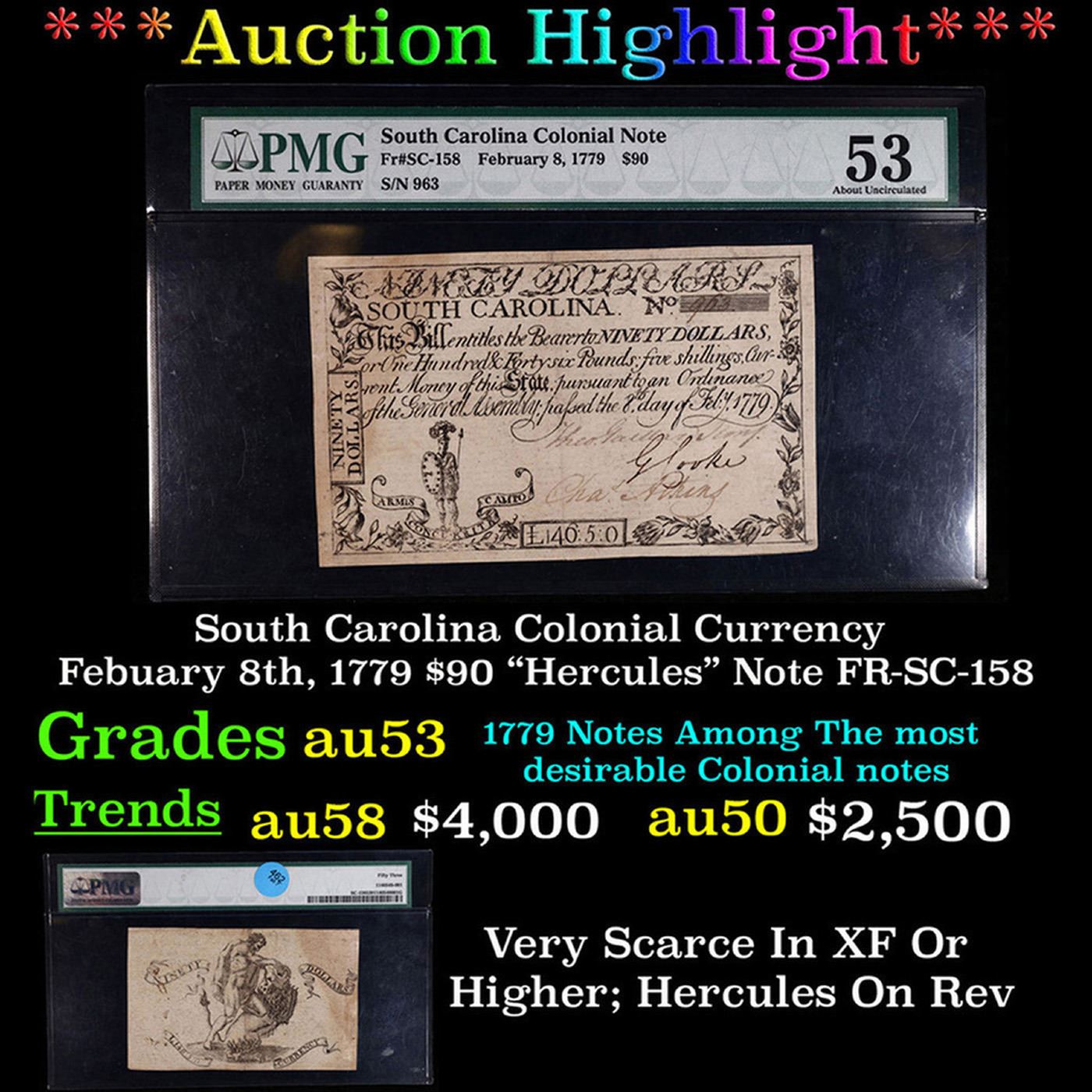 ***Auction Highlight*** South Carolina Colonial Currency Febuary 8th, 1779 $90 "Hercules" Note FR-SC-158 Graded au53 By PMG. An Au55 is on ebay right now for $3000 A boldly printed, evenly margined example of this extremely popular Colonial note. The note was engraved by Thomas Coram of Charleston, South Carolina. The $40, $60, $80, and $100 denominations were part of the original $1,000,000 authorized. Later the $50, $70, and $90 denominations were added. The front shows a Warrior at lower left surrounded by a banner stating ARMISA CONCURRITE CAMPO, which Newman translates "Assemble the field of arms." A series that is widely appreciated for its variety of mythological vignettes. This $90 note does not disappoint in that regard, as we are blessed with the visage of Hercules strangling the Nemean lion, the first of his Twelve Labors. ARTIST: Thomas Coram (1757-1811) emigrated from Bristol, England, to the colonies in 1769. He went into the mercantile business and joined with twelve other merchants and thirteen planters in an association “to discontinue the Importation of European and East-India Goods and Negroes into this Province.” After 1770 he became an engraver. In 1784 he advertised as a drawing master. An ardent supporter of the American Revolution, Coram engraved bills of credit for the State of South Carolina during the war. Coram was the first Charleston artist to use historical subjects; his most ambitious engraving is a three-part print called “The Battle of Fort Moultrie,” published in the 1780s. According to the city directories, Coram listed his profession as “engraver” until 1802. Thereafter he was listed as “painter and engraver.” He was instructed in oil painting by Henry Benbridge (1743-1812), another artist in Charleston. Coram is known for his portraits, as well as several small but intricate local landscapes. He was a benefactor of the Charleston Orphanage, to which he gave numerous works and money. Coram was buried in the cemetery of St. Phillips Church in Charleston. A Corey's Pick, Bid to Win, Don't let it get Away, you might not find its equal Coin. I give this coin my highest recommendation
