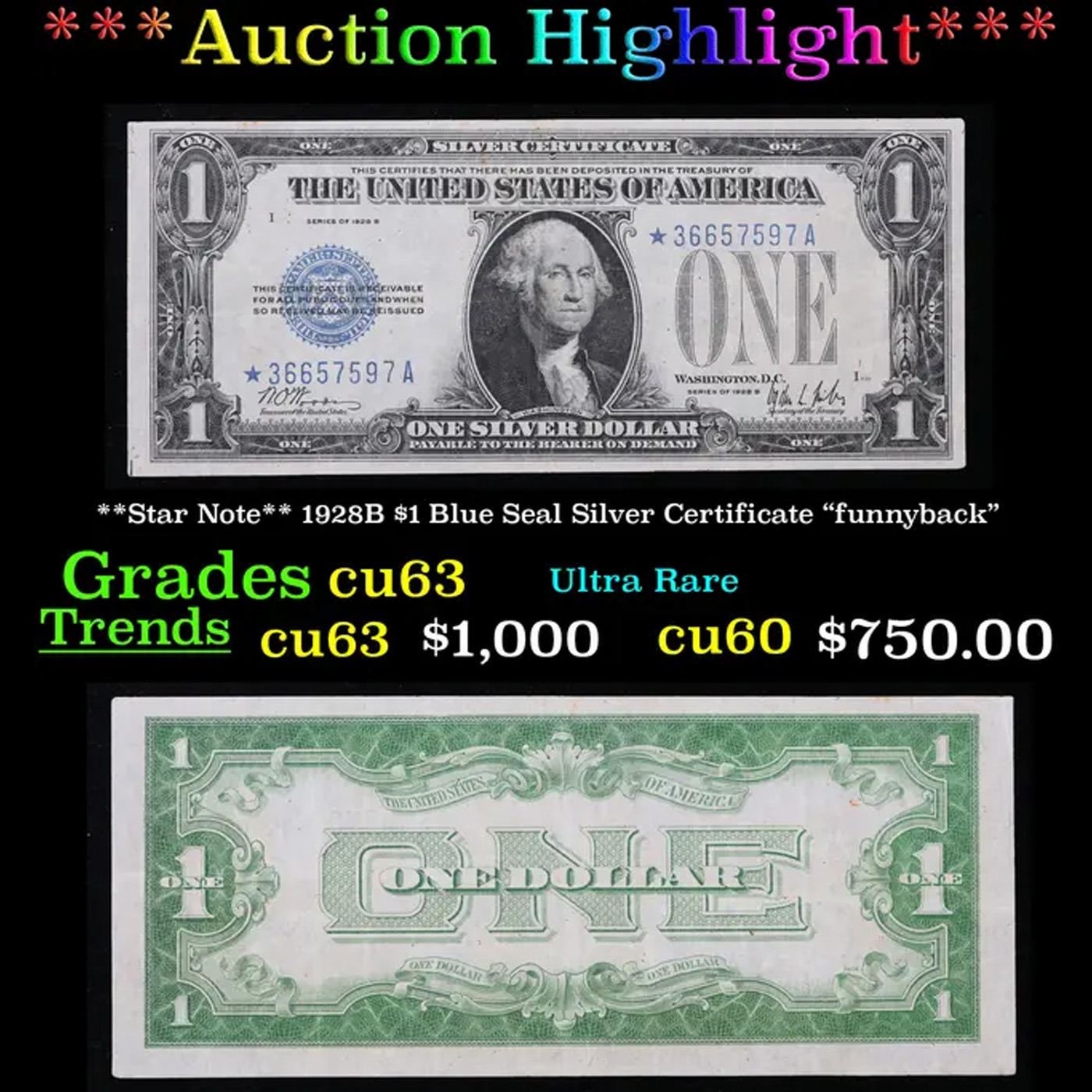 ***Auction Highlight*** **Star Note** 1928B $1 Blue Seal Silver Certificate "funnyback" Grades Selec