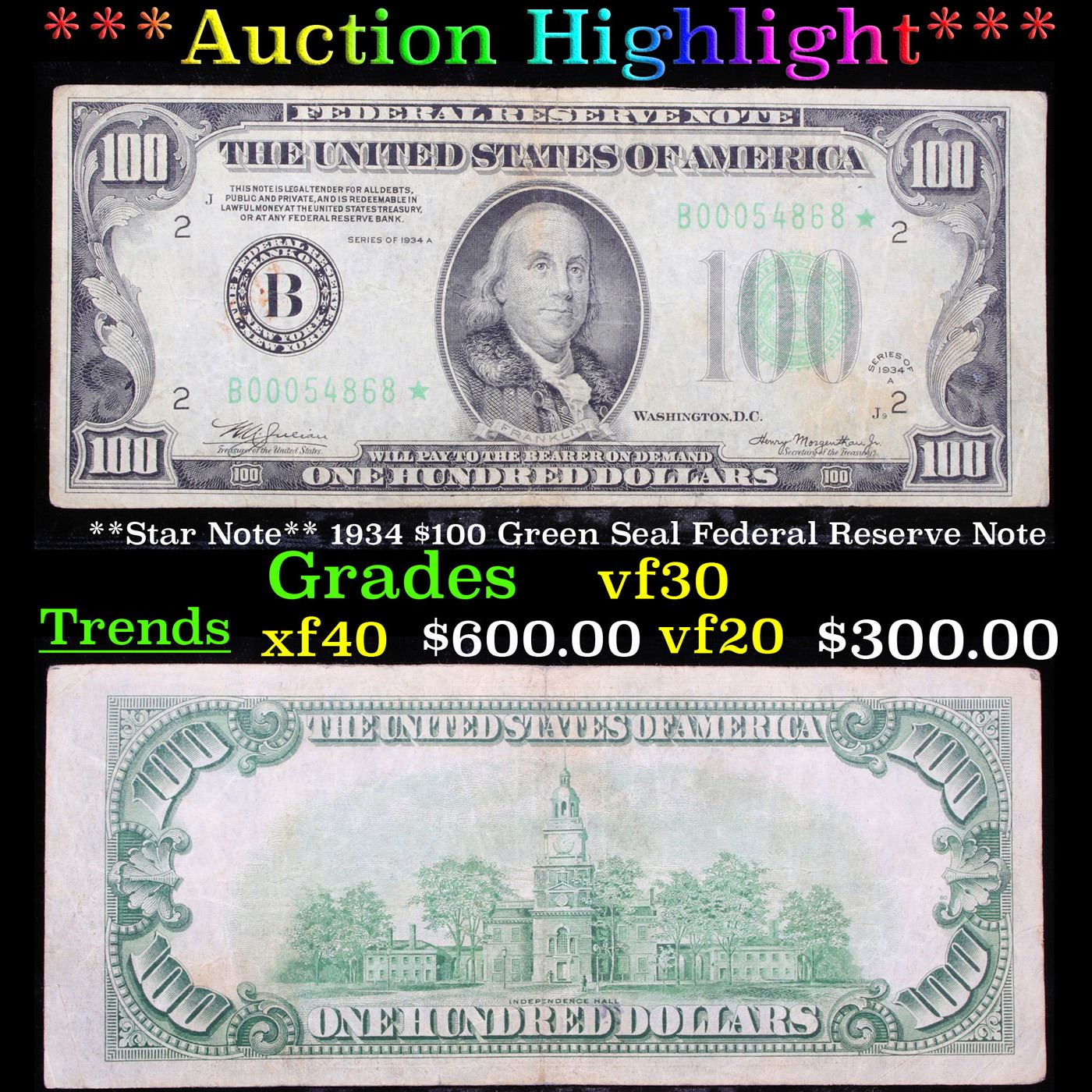 ***Auction Highlight*** **Star Note** 1934 $100 Green Seal Federal Reserve Note Grades vf++.