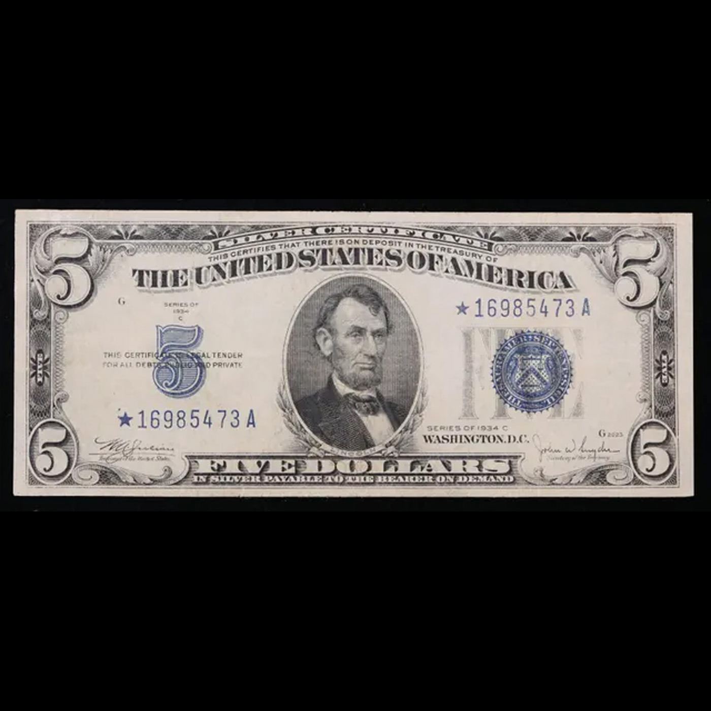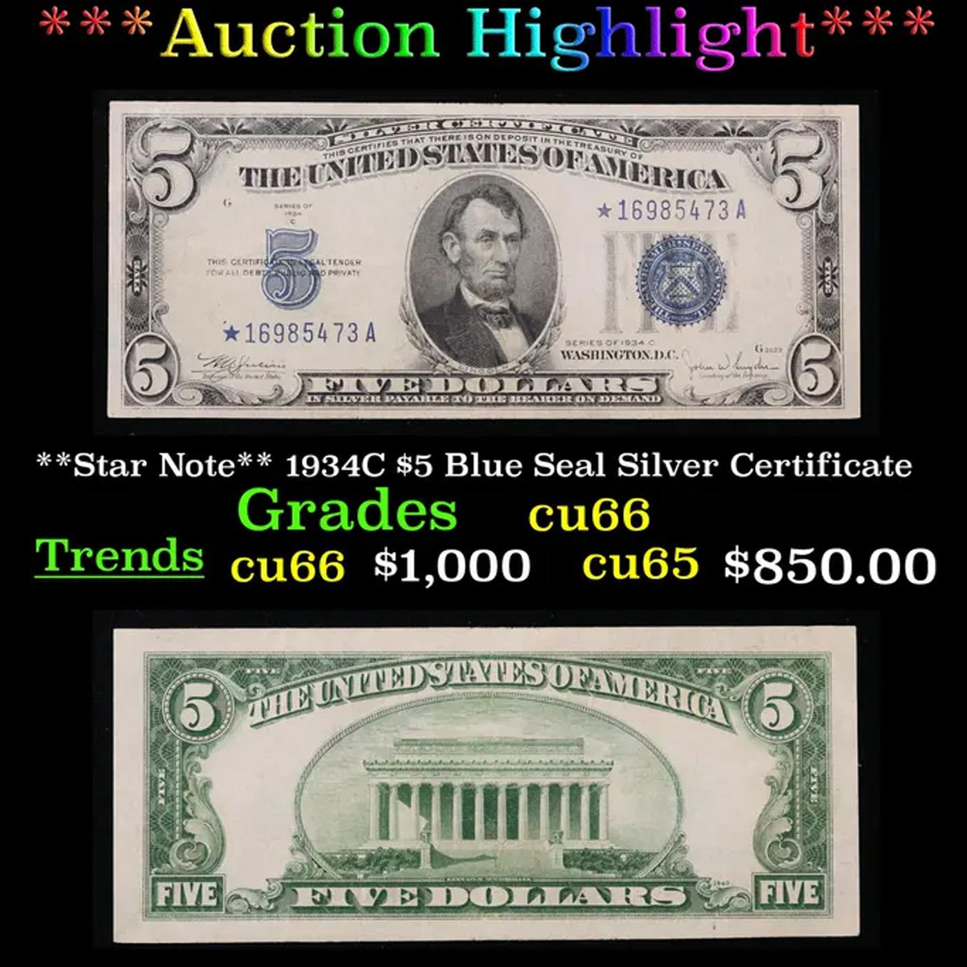 ***Auction Highlight*** **Star Note** 1934C $5 Blue Seal Silver Certificate Grades Gem+ CU. A Key Date's Pick, Bid to Win, Don't let it get Away, you might not find its equal Coin