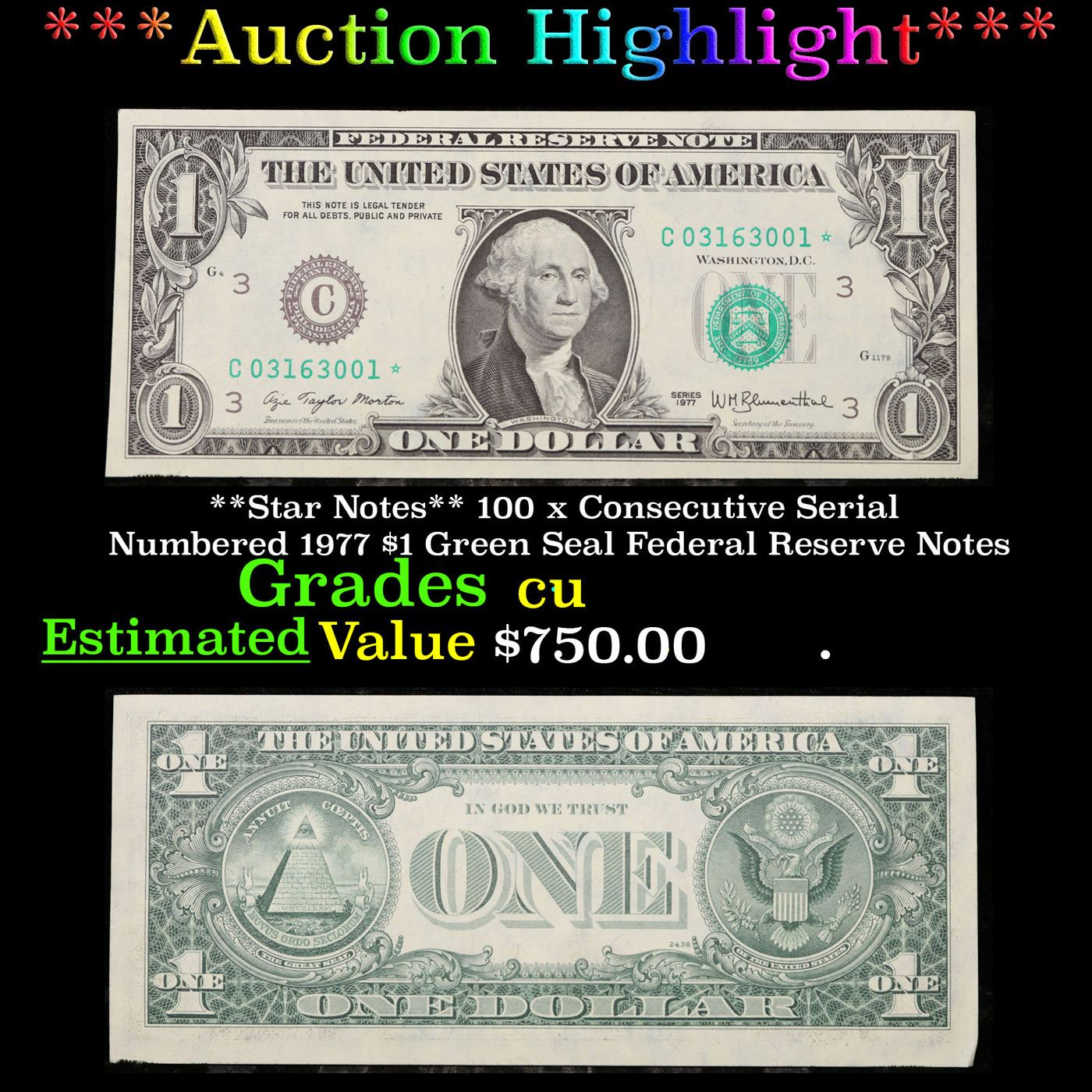 ***Auction Highlight*** **Star Notes** 100 x Consecutive Serial Numbered 1977 $1 Green Seal Federal Reserve Notes Grades CU. A Corey's Pick, Bid to Win Coin
