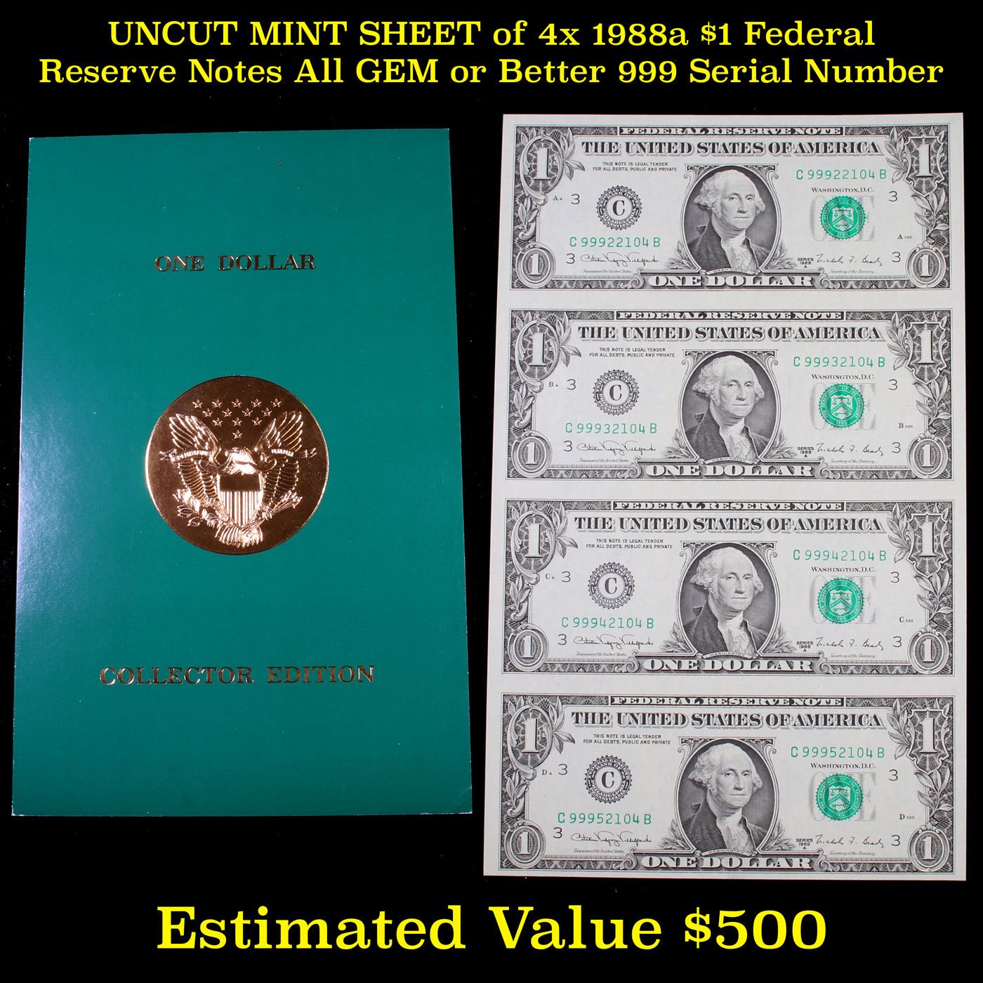 ***Auction Highlight*** UNCUT MINT SHEET of 4x 1988a $1 Federal Reserve Notes All GEM or Better 999 Serial Number. 1x 1988a cu65 Trends $85, cu66 $100, cu67 $150
