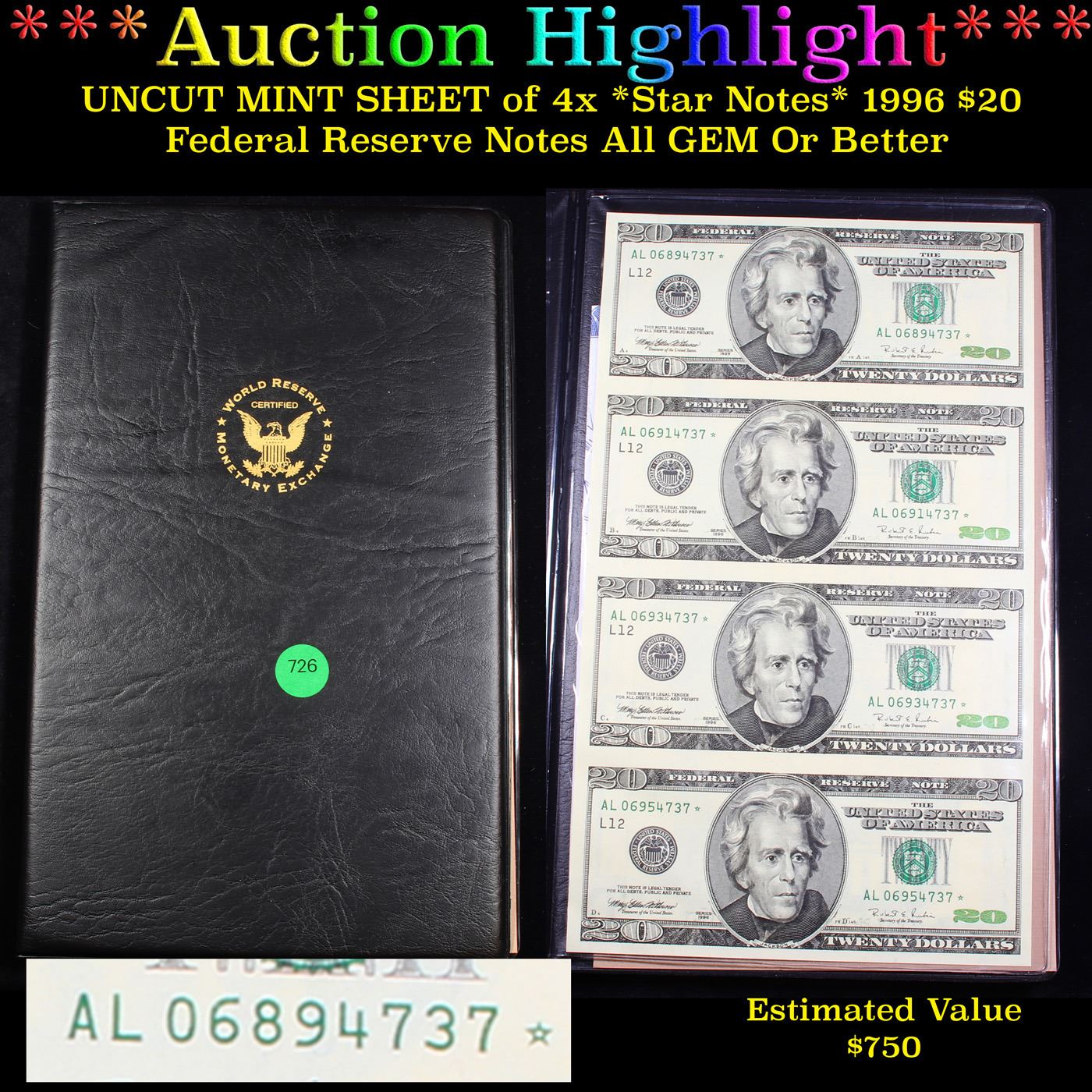 ***Auction Highlight*** UNCUT MINT SHEET of 4x *Star Notes* 1996 $20 Federal Reserve Notes All GEM Or Better.