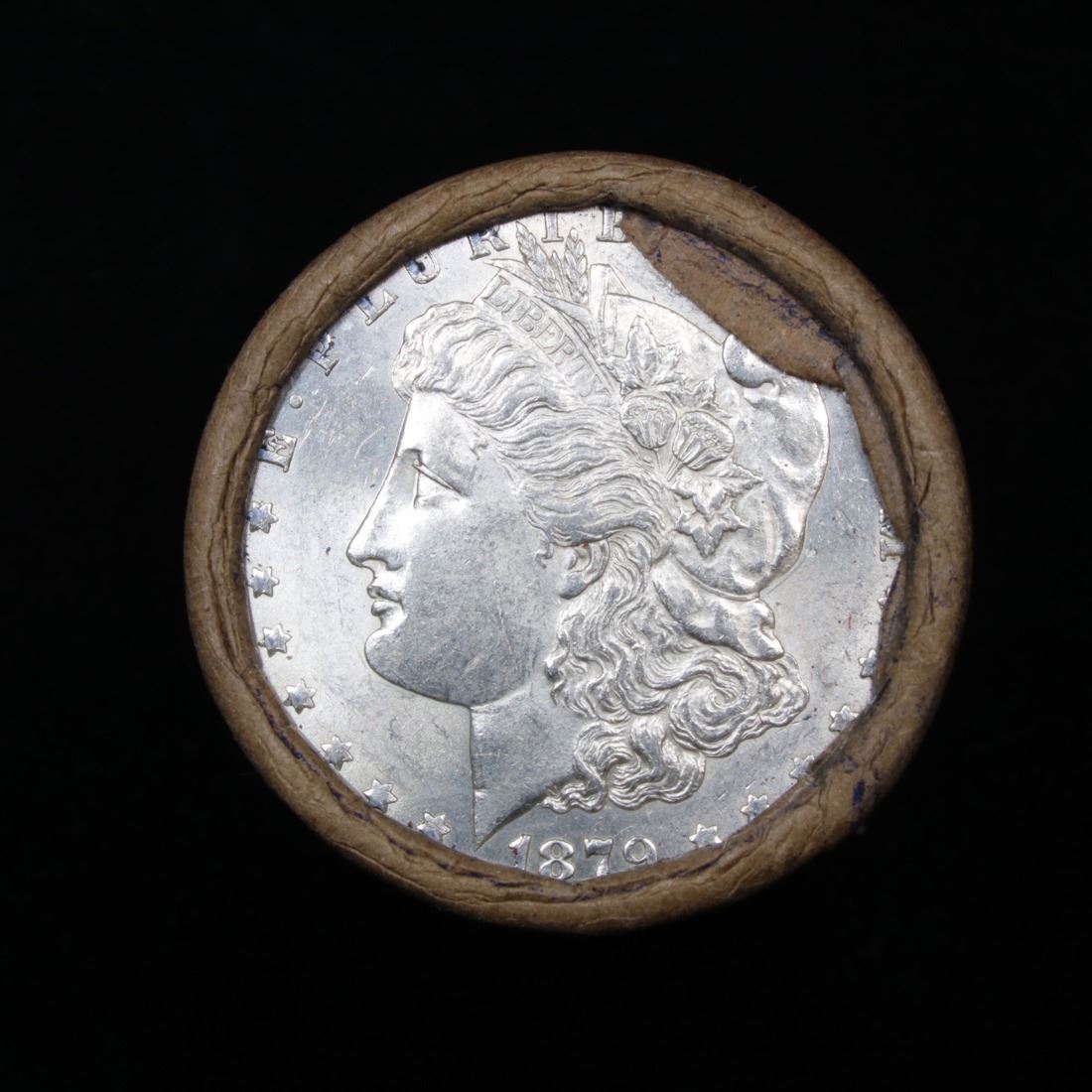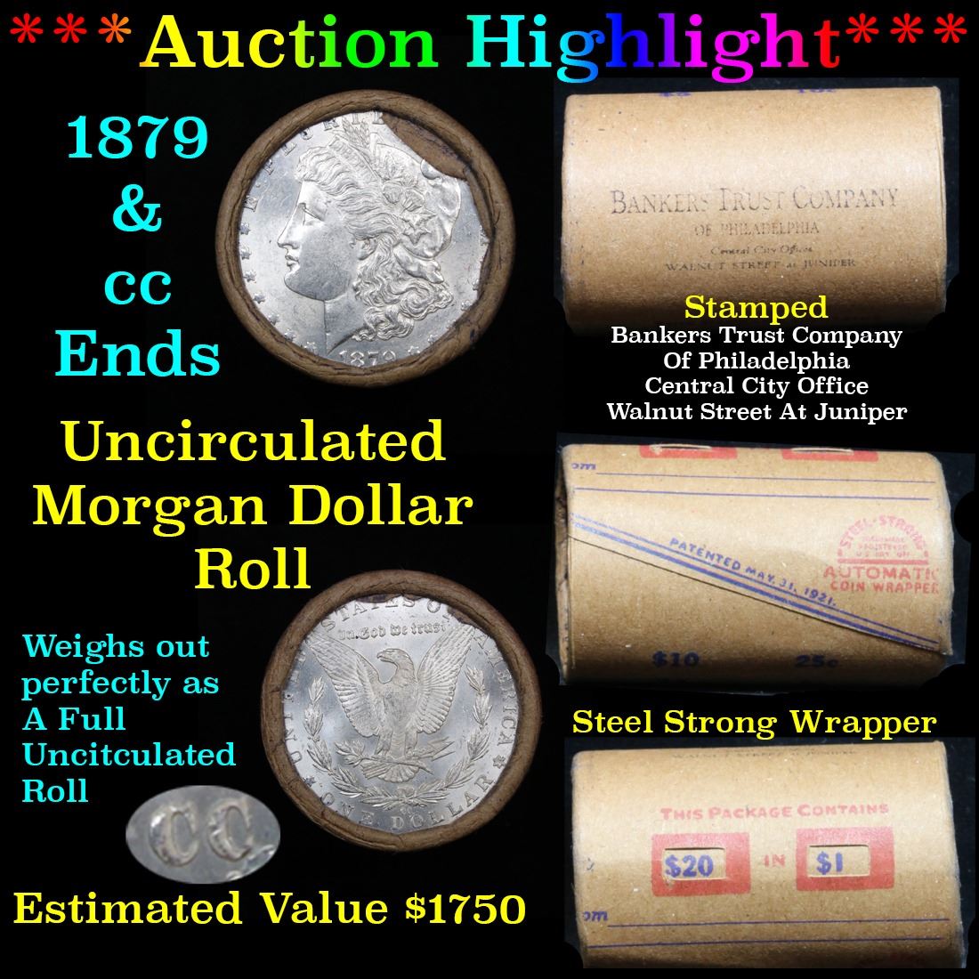 ***Auction Highlight*** Unc Shotgun roll Morgan dollars 1879 & 'cc' mint ends Corey Morgan $1 roll. Great Original Uncirculated Roll of Morgan Dollars. The roll is held in an old "Steel Strong Automatic" Wrapper Dated from 1921. The Roll is also faintly stamped "Banker Trust of Philadelphia, Central City Office, Walnut Street at Juniper". I researched that name and the Bank closed in the post-Crash of '29 Depression period (my research showed that it failed on Dec 22, 1930). The Two ends showing are the obverse of an 1879, and the other end has a 'cc' Carson City Mint Reverse. We received this incredible consignment from a private collector. The consignee gave us his father's entire estate hoard of shotgun rolled coins. The rolls are marked Unc and based on the weight of the roll, it weighs out at 534.60 grams which confirms it is an uncirculated rolls. Based on the ends that we can see, they seem to be PQ rolls. Some lucky bidders may get key dates, high grades, PL's and DMPL's. Your choice, but if you do open the Roll, please let us know what you find. A Corey's Pick, Bid to Win, Don't let it get Away lot.